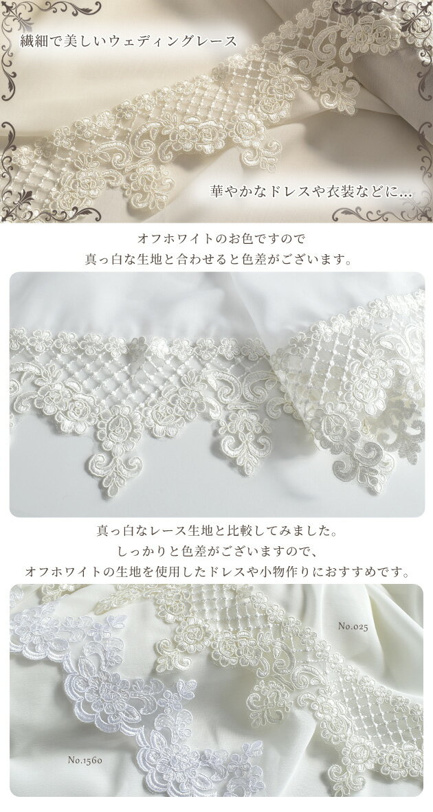 ★ 3,980円以上ご注文で、宅配便・ゆうパケット 送料無料 ★【1】日本郵便 ゆうパケット(メール便) 全国一律 280円■ポストへのお届け(盗難、未投函などの補償なし。日時指定不可。)■厚み3cm、3辺合計60cm以内まで★規定サイズ内に収めるコツ★商品名上に記載の 「#ゆうパケ○点可」 の数字をご参考に、上手にお買い物なさってください。※同一商品を注文した場合、何点まで入るかの目安の数字となります。【下記の場合、宅配便に変更させていただきます↓】・規定サイズを超える場合★同時に送料も変更させていただきます。■「ゆうパケット送料無料」と記載のある商品で、送料無料希望の方はゆうパケットをご選択ください。ただし、「ゆうパケット送料無料」商品をご注文でも、宅配便希望の場合は、宅配便をご選択ください(送料の差額が発生します)。------------------------【2】日本郵便 ゆうパック(宅配便) 全国一律 650円日時指定OK!■3,980円以上のお買い上げでも、配送方法「ゆうパケット」希望にチェックがある場合は、ゆうパケットでのお届けとなります。【ゆうパケット・ゆうパック共通注意事項】※ご注文後に、複数通に分けてのご発送はできかねます。■ロット(生産時期)が異なると、同じ品番のものでもカラー、サイズ、品質が変わります。同じ種類、材料、染料を用いても製造過程において完璧に同じものを再現することが難しく、このような現象はどの商品にも見られます。 詳しくはこちら→前回とは色や幅が異なるという理由での、返品交換はお断りをしていますのでご理解ください。■領収書、明細書は同封しておりません。(エコ、個人情報保護、配送のスピード化などの理由によるため)【1】領収書商品発送後、購入履歴画面の「領収書を発行する」ボタンからPDFで発行できます。(※後払い決済を除く)▼下記の場合は、領収書の発行は出来ません。【後払い決済】運収納印のある払込受領書が公的な領収書となります。【クレジット】お客様ご契約のクレジット会社が発行するご利用明細書が代わりとなります。【コンビニ決済】払込受領証が領収書となります。【全額ポイント支払い】ご請求金額が0円のため発行できません。------------------------【1】明細書▼明細書をお入れしておりません。・「ご注文確定メール」が明細書の代わりとなります。・楽天会員様はご購入履歴からもご確認いただけます。------------------------当店からのメールを必ず受信していただきますよう、「ドメイン指定受信解除」していただきますようお願いいたします。(my-mama@d5.dion.ne.jp と、 auc-my-mama@shop.rakuten.co.jp)【1】商品のカットに関しまして・生地、ブレード、ゴム等、長さを指定してのカットのご依頼はお受けできかねます。(例:1Mを5枚に分けて、1M・2Mを1枚ずつ、など)・カット販売の商品に関しましては、ご注文いただいた数量をつながった状態でお届け致します。(ご注文数が多い場合は途中でカットしたものをお届けする場合がございます。)【1m単位カット販売】 ウェディング チュールレースお花とダイヤ幅広 約100mm幅ウェディングに使える美しいレース。以前よりクオリティも良くなり、価格もお安くなりました◎こちらのレースは真っ白ではなく、オフホワイトのお色となります。チュール生地に上から縫いつけるだけでベールを作ることも出来ます。国産の完璧なレースでご紹介がしたかったのですが、大変高価なものになることもあり国産でのご用意ができませんでした。ヒートカットという熱処理でレース先端をカットされているので焦げているのかな・・・というような箇所もございます。また、刺繍の糸が出ていたり、チュール地のカットが悪いなどの現象もございます。その為、糸をカットするなどの手を加えていただかねばならない場合もございます。上記のようなレースですが、上品な光沢感もあり豪華さは満点です。豪華なドレス作りにお役立て下さい。 ↓比較したホワイトのレースはこちら↓ウェディング レース スカラップ約90mm幅↓使用しているレースは異なりますが、このようなイメージでご使用頂けます↓【商品詳細】■商品番号とサイズ025 幅:約100mm幅■素材ポリエステル■カラーオフホワイト■販売単位1m単位のカット販売1mご希望の方は数量1、2mご希望の方は数量2とご注文下さい。※数量が多い場合、途中で途切れた状態でのお届けとなる場合がございます。 ご了承ください。■リニューアル21/7/2 デザインが変更になりました。以前よりクオリティが上がり、価格もお安くなりました。 ■ゆうパケット5点(5m)まで可能■ご注意・刺繍の糸が絡まっていたり、飛び出している箇所がある場合がございます。気になる所はカットしてご使用下さい。・チュールのカットは熱で溶かすヒートカット製法のため、綺麗でなかったり、焦げているような箇所がある場合がございます。・小さな汚れが付いていたり他の色の糸が混入している場合がございます。これらは生産工程上避けられな