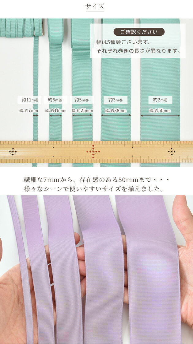 ★ 3,980円以上ご注文で、宅配便・ゆうパケット 送料無料 ★【1】日本郵便 ゆうパケット(メール便) 全国一律 280円■ポストへのお届け(盗難、未投函などの補償なし。日時指定不可。)■厚み3cm、3辺合計60cm以内まで★規定サイズ内に収めるコツ★商品名上に記載の 「#ゆうパケ○点可」 の数字をご参考に、上手にお買い物なさってください。※同一商品を注文した場合、何点まで入るかの目安の数字となります。【下記の場合、宅配便に変更させていただきます↓】・規定サイズを超える場合★同時に送料も変更させていただきます。■「ゆうパケット送料無料」と記載のある商品で、送料無料希望の方はゆうパケットをご選択ください。ただし、「ゆうパケット送料無料」商品をご注文でも、宅配便希望の場合は、宅配便をご選択ください(送料の差額が発生します)。------------------------【2】日本郵便 ゆうパック(宅配便) 全国一律 650円日時指定OK!■3,980円以上のお買い上げでも、配送方法「ゆうパケット」希望にチェックがある場合は、ゆうパケットでのお届けとなります。【ゆうパケット・ゆうパック共通注意事項】※ご注文後に、複数通に分けてのご発送はできかねます。■ロット(生産時期)が異なると、同じ品番のものでもカラー、サイズ、品質が変わります。同じ種類、材料、染料を用いても製造過程において完璧に同じものを再現することが難しく、このような現象はどの商品にも見られます。 詳しくはこちら→前回とは色や幅が異なるという理由での、返品交換はお断りをしていますのでご理解ください。■領収書、明細書は同封しておりません。(エコ、個人情報保護、配送のスピード化などの理由によるため)【1】領収書商品発送後、購入履歴画面の「領収書を発行する」ボタンからPDFで発行できます。(※後払い決済を除く)▼下記の場合は、領収書の発行は出来ません。【後払い決済】運収納印のある払込受領書が公的な領収書となります。【クレジット】お客様ご契約のクレジット会社が発行するご利用明細書が代わりとなります。【コンビニ決済】払込受領証が領収書となります。【全額ポイント支払い】ご請求金額が0円のため発行できません。------------------------【1】明細書▼明細書をお入れしておりません。・「ご注文確定メール」が明細書の代わりとなります。・楽天会員様はご購入履歴からもご確認いただけます。------------------------当店からのメールを必ず受信していただきますよう、「ドメイン指定受信解除」していただきますようお願いいたします。(my-mama@d5.dion.ne.jp と、 auc-my-mama@shop.rakuten.co.jp)【1】商品のカットに関しまして・生地、ブレード、ゴム等、長さを指定してのカットのご依頼はお受けできかねます。(例:1Mを5枚に分けて、1M・2Mを1枚ずつ、など)・カット販売の商品に関しましては、ご注文いただいた数量をつながった状態でお届け致します。(ご注文数が多い場合は途中でカットしたものをお届けする場合がございます。)グログランリボン7mm・16mm・25mm・38mm・50mm幅思わずうっとりしてしまう、上品なくすみカラーを厳選しました!お色は全部で8色 2~11m入とたっぷりはいっています。フォーマルなアクセサリーや、ナチュラルなお洋服にも合わせやすいニュアンスカラーです。繊細なうねと光沢が、よりいっそうエレガントに魅せます。幅も5種類ありますので、異なる幅のリボンを組み合わせても素敵な作品に仕上がります。著名なリボン作家さんにリボンをご使用いただきました。驚くほどに美しい作品に仕上げて頂きました!【商品詳細】■商品番号オフホワイト7mm【16506-1】 16mm【16516-1】 25mm【16525-1】38mm【16538-1】 50mm【16550-1】ベージュローゼ7mm【16506-2】 16mm【16516-2】 25mm【16525-2】38mm 【16538-2】 50mm【16550-2】ピンク7mm【16506-3】 16mm【16516-3】 25mm【16525-3】38mm【16538-3】 50mm【16550-3】ラベンダー7mm【16506-4】 16mm【16516-4】 25mm【16525-4】38mm【16538-4】 50mm【16550-4】ターコイズ7mm【16506-5】 16mm【16516-5】 25mm【16525-5】38mm【16538-5】 50mm【16550-5】モスグリーン7mm【16506-6】 16mm【16516-6】 25mm【16525-6】38mm【16538-6】 7mm【16550-6】グレー7mm【16506-7】 16mm【16516-7】 25mm【16525-7】38mm【16538-7】 50mm【16550-7】モカ7mm【16506-8】 16mm【16516-8】 25mm【16525-8】38mm【16538-8】 50mm【16550-8】■素材ポリエステル100%※ポリエステル100%で作られておりますので、リボンの厚みは薄手です。■カラー全8色(オフホワイト・ベージュローゼ・ピンク・ラベンダー・ターコイズ・モスグリーン・シルバー・モカ)■サイズ【サイズ:数量】幅約7mm:約11m幅約16mm:約6m幅約25mm:約5m幅約38mm:約3m幅約50mm:約2m厚み:約0.3mm前後■ゆうパケット7mm 16点、16mm 20点、25mm 28点、38mm 30点、50mm 36点可■ご注意・途中でカットされ2本になっている場合もございます。その際は長めにお入れ致します。・端のしまつが切りっぱなしとなる為、一部糸が飛び出ている場合がございます、カットして頂ければ問題なくご利用頂けます。・ロットにより色合いやリボンの幅やフリンジ部