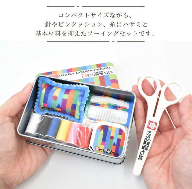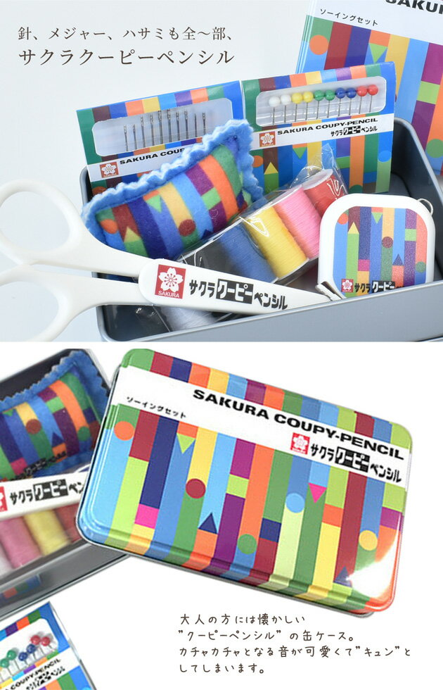★ 3,980円以上ご注文で、宅配便・ゆうパケット 送料無料 ★【1】日本郵便 ゆうパケット(メール便) 全国一律 280円■ポストへのお届け(盗難、未投函などの補償なし。日時指定不可。)■厚み3cm、3辺合計60cm以内まで★規定サイズ内に収めるコツ★商品名上に記載の 「#ゆうパケ○点可」 の数字をご参考に、上手にお買い物なさってください。※同一商品を注文した場合、何点まで入るかの目安の数字となります。【下記の場合、宅配便に変更させていただきます↓】・規定サイズを超える場合★同時に送料も変更させていただきます。■「ゆうパケット送料無料」と記載のある商品で、送料無料希望の方はゆうパケットをご選択ください。ただし、「ゆうパケット送料無料」商品をご注文でも、宅配便希望の場合は、宅配便をご選択ください(送料の差額が発生します)。------------------------【2】日本郵便 ゆうパック(宅配便) 全国一律 650円日時指定OK!■3,980円以上のお買い上げでも、配送方法「ゆうパケット」希望にチェックがある場合は、ゆうパケットでのお届けとなります。【ゆうパケット・ゆうパック共通注意事項】※ご注文後に、複数通に分けてのご発送はできかねます。■ロット(生産時期)が異なると、同じ品番のものでもカラー、サイズ、品質が変わります。同じ種類、材料、染料を用いても製造過程において完璧に同じものを再現することが難しく、このような現象はどの商品にも見られます。 詳しくはこちら→前回とは色や幅が異なるという理由での、返品交換はお断りをしていますのでご理解ください。■領収書、明細書は同封しておりません。(エコ、個人情報保護、配送のスピード化などの理由によるため)【1】領収書商品発送後、購入履歴画面の「領収書を発行する」ボタンからPDFで発行できます。(※後払い決済を除く)▼下記の場合は、領収書の発行は出来ません。【後払い決済】運収納印のある払込受領書が公的な領収書となります。【クレジット】お客様ご契約のクレジット会社が発行するご利用明細書が代わりとなります。【コンビニ決済】払込受領証が領収書となります。【全額ポイント支払い】ご請求金額が0円のため発行できません。------------------------【1】明細書▼明細書をお入れしておりません。・「ご注文確定メール」が明細書の代わりとなります。・楽天会員様はご購入履歴からもご確認いただけます。------------------------当店からのメールを必ず受信していただきますよう、「ドメイン指定受信解除」していただきますようお願いいたします。(my-mama@d5.dion.ne.jp と、 auc-my-mama@shop.rakuten.co.jp)【1】商品のカットに関しまして・生地、ブレード、ゴム等、長さを指定してのカットのご依頼はお受けできかねます。(例:1Mを5枚に分けて、1M・2Mを1枚ずつ、など)・カット販売の商品に関しましては、ご注文いただいた数量をつながった状態でお届け致します。(ご注文数が多い場合は途中でカットしたものをお届けする場合がございます。)サクラ クーピーペンシルのソーイング6点セット小学校でお馴染みのクーピーペンシル。そのクーピーペンシルが、裁縫道具となって登場!本物同様、缶ケースに入ったソーイングセットは、針やメジャー、ピンクッション、全てがクーピーペンシルそのもの。学校のお道具箱に間違って入れちゃいそうな、かわいいソーイングセットです。まち針と糸は、クーピーペンシルのカラーに合わせて作っているのもポイント!手芸好きの方へのプレゼントにもオススメです。【商品詳細】■商品番号GSS-902■サイズ外箱サイズ W122mm × D77mm × H37mm■セット内容・まち針 10本 ・縫い針(ワンタッチ針)10本 ・自動巻メジャー 1m・ピンクッション ・はさみ ・ポリエステルスパン糸 各 約5m巻 ■ゆうパケットゆうパケット不可 宅配便のみ■ご注意・画像では100%同じお色を表現することが出来ません。出来る限り近いお色になるよう心がけてはおりますが、実際のお色味と異なる場合がございます。■おすすめカテゴリソーイングセット・ソーイングボックスはこちら ↓サクラシリーズは【サクラクレパス】もございます。↓ソーイングセット サクラクーピークレパス