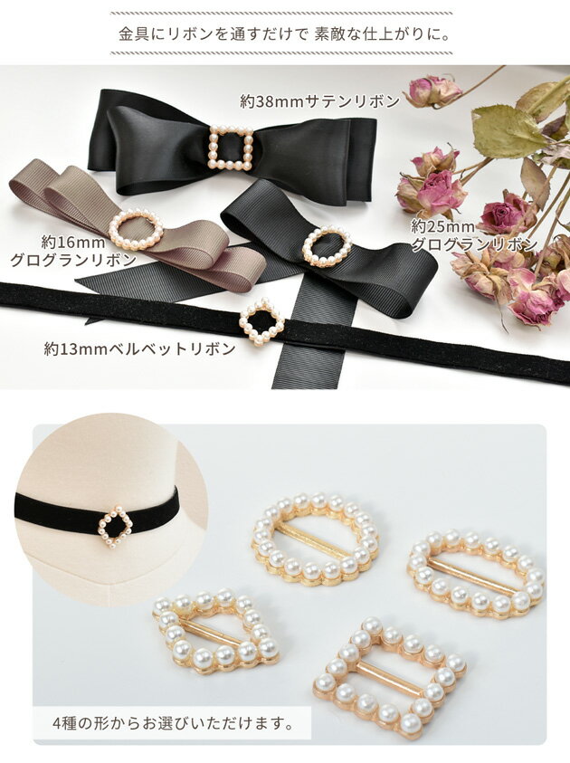 パール バックル ベルト送り 4種 4個入 ■ 19mm 16mm 13mm 12mm コキカン センターパーツ リボン バックルスライダー リボン通し カボション スクエア ラウンド ベルト調整 アクセサリー 帯留め パーツ 装飾 手芸 アジャスター ハンドメイド 手作り ■