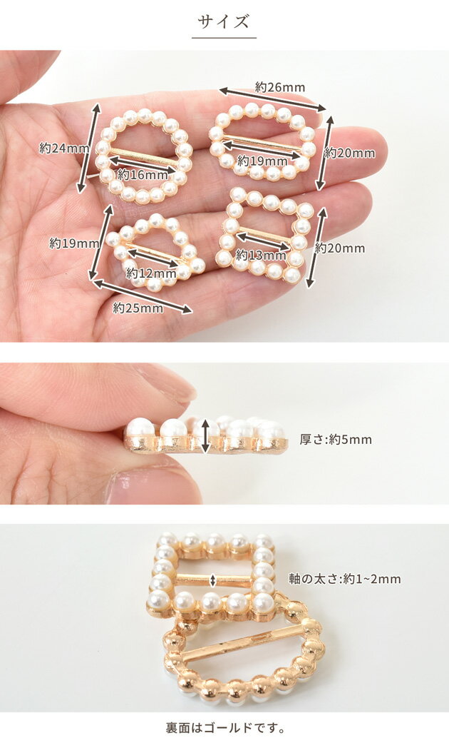 ★ 3,980円以上ご注文で、宅配便・ゆうパケット 送料無料 ★【1】日本郵便 ゆうパケット(メール便) 全国一律 280円■ポストへのお届け(盗難、未投函などの補償なし。日時指定不可。)■厚み3cm、3辺合計60cm以内まで★規定サイズ内に収めるコツ★商品名上に記載の 「#ゆうパケ○点可」 の数字をご参考に、上手にお買い物なさってください。※同一商品を注文した場合、何点まで入るかの目安の数字となります。【下記の場合、宅配便に変更させていただきます↓】・規定サイズを超える場合★同時に送料も変更させていただきます。■「ゆうパケット送料無料」と記載のある商品で、送料無料希望の方はゆうパケットをご選択ください。ただし、「ゆうパケット送料無料」商品をご注文でも、宅配便希望の場合は、宅配便をご選択ください(送料の差額が発生します)。------------------------【2】日本郵便 ゆうパック(宅配便) 全国一律 650円日時指定OK!■3,980円以上のお買い上げでも、配送方法「ゆうパケット」希望にチェックがある場合は、ゆうパケットでのお届けとなります。【ゆうパケット・ゆうパック共通注意事項】※ご注文後に、複数通に分けてのご発送はできかねます。■ロット(生産時期)が異なると、同じ品番のものでもカラー、サイズ、品質が変わります。同じ種類、材料、染料を用いても製造過程において完璧に同じものを再現することが難しく、このような現象はどの商品にも見られます。 詳しくはこちら→前回とは色や幅が異なるという理由での、返品交換はお断りをしていますのでご理解ください。■領収書、明細書は同封しておりません。(エコ、個人情報保護、配送のスピード化などの理由によるため)【1】領収書商品発送後、購入履歴画面の「領収書を発行する」ボタンからPDFで発行できます。(※後払い決済を除く)▼下記の場合は、領収書の発行は出来ません。【後払い決済】運収納印のある払込受領書が公的な領収書となります。【クレジット】お客様ご契約のクレジット会社が発行するご利用明細書が代わりとなります。【コンビニ決済】払込受領証が領収書となります。【全額ポイント支払い】ご請求金額が0円のため発行できません。------------------------【1】明細書▼明細書をお入れしておりません。・「ご注文確定メール」が明細書の代わりとなります。・楽天会員様はご購入履歴からもご確認いただけます。------------------------当店からのメールを必ず受信していただきますよう、「ドメイン指定受信解除」していただきますようお願いいたします。(my-mama@d5.dion.ne.jp と、 auc-my-mama@shop.rakuten.co.jp)【1】商品のカットに関しまして・生地、ブレード、ゴム等、長さを指定してのカットのご依頼はお受けできかねます。(例:1Mを5枚に分けて、1M・2Mを1枚ずつ、など)・カット販売の商品に関しましては、ご注文いただいた数量をつながった状態でお届け致します。(ご注文数が多い場合は途中でカットしたものをお届けする場合がございます。)~パール バックル(ベルト送り)~4個入簡単に華やかな仕上がりになるパールバックル。しっかり存在感があってリボンのセンターパーツにぴったりです。ブレスレット チョーカー ネックレスや、ドレスのオシャレなアジャスター、カバンのワンポイント、プレゼントのラッピングにもどうぞ。↓サンプルで使用したリボンはこちら↓くすみカラー の グログラン リボン 幅5種 全8色両面 サテンリボン 38~40mm幅片面 ベルベットリボン 13mm幅【商品詳細】■商品番号【2032-1】丸形【2032-2】楕円形【2032-3】ひし形【2032-4】四角形【2032-5】ミックス■素材合金、プラスチック■サイズ画像でご確認下さい。■数量4個入り■ゆうパケット100点まで可■ご注意・アクセパーツ類の汗や皮脂汚れによる変色は完全に避けることはできません。ご使用後は必ず汗や汚れをつけたまま保管せぬようご注意ください。小さな傷や汚れが付着している場合がございます。これらは生産工程上避けられない仕様となります。・バリが残っている場合がございます。・生産ロットにより若干デザインやサイズ等異なる場合がございます。ご了承の上、ご購入ください。・画像では100%同じお色を表現することはできません。できる限り近いお色になるよう心がけてはおりますが、お色のイメージが異なる場合でのご返品は承ることが出来ません事をご了承ください。上記での返品・交換は承ることが出来ません。予めご了承の上、お買い求めお願い申し上げます。■おすすめカテゴリ・その他のバックルはこちらから ・その他のリボンはこちらから↓ こちらも一緒にいかがですか ↓ラインストーン付き バックル ベルト送り 3種リボンセンターパーツ 5mm 10mm 14mmその他のバックルはこちらからその他のリボンはこちらから
