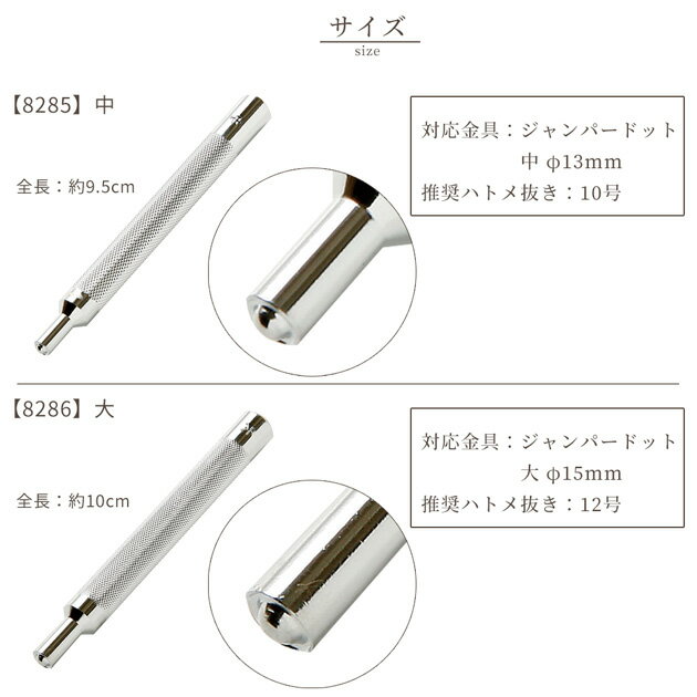★ 3,980円以上ご注文で、宅配便・ゆうパケット 送料無料 ★【1】日本郵便 ゆうパケット(メール便) 全国一律 280円■ポストへのお届け(盗難、未投函などの補償なし。日時指定不可。)■厚み3cm、3辺合計60cm以内まで★規定サイズ内に収めるコツ★商品名上に記載の 「#ゆうパケ○点可」 の数字をご参考に、上手にお買い物なさってください。※同一商品を注文した場合、何点まで入るかの目安の数字となります。【下記の場合、宅配便に変更させていただきます↓】・規定サイズを超える場合★同時に送料も変更させていただきます。■「ゆうパケット送料無料」と記載のある商品で、送料無料希望の方はゆうパケットをご選択ください。ただし、「ゆうパケット送料無料」商品をご注文でも、宅配便希望の場合は、宅配便をご選択ください(送料の差額が発生します)。------------------------【2】日本郵便 ゆうパック(宅配便) 全国一律 650円日時指定OK!■3,980円以上のお買い上げでも、配送方法「ゆうパケット」希望にチェックがある場合は、ゆうパケットでのお届けとなります。【ゆうパケット・ゆうパック共通注意事項】※ご注文後に、複数通に分けてのご発送はできかねます。■ロット(生産時期)が異なると、同じ品番のものでもカラー、サイズ、品質が変わります。同じ種類、材料、染料を用いても製造過程において完璧に同じものを再現することが難しく、このような現象はどの商品にも見られます。 詳しくはこちら→前回とは色や幅が異なるという理由での、返品交換はお断りをしていますのでご理解ください。■領収書、明細書は同封しておりません。(エコ、個人情報保護、配送のスピード化などの理由によるため)【1】領収書商品発送後、購入履歴画面の「領収書を発行する」ボタンからPDFで発行できます。(※後払い決済を除く)▼下記の場合は、領収書の発行は出来ません。【後払い決済】運収納印のある払込受領書が公的な領収書となります。【クレジット】お客様ご契約のクレジット会社が発行するご利用明細書が代わりとなります。【コンビニ決済】払込受領証が領収書となります。【全額ポイント支払い】ご請求金額が0円のため発行できません。------------------------【1】明細書▼明細書をお入れしておりません。・「ご注文確定メール」が明細書の代わりとなります。・楽天会員様はご購入履歴からもご確認いただけます。------------------------当店からのメールを必ず受信していただきますよう、「ドメイン指定受信解除」していただきますようお願いいたします。(my-mama@d5.dion.ne.jp と、 auc-my-mama@shop.rakuten.co.jp)【1】商品のカットに関しまして・生地、ブレード、ゴム等、長さを指定してのカットのご依頼はお受けできかねます。(例:1Mを5枚に分けて、1M・2Mを1枚ずつ、など)・カット販売の商品に関しましては、ご注文いただいた数量をつながった状態でお届け致します。(ご注文数が多い場合は途中でカットしたものをお届けする場合がございます。)クラフト社ジャンパードット打 中・大全2サイズジャンパードットを取り付けるための打ち具皮革にセットした金具を打台にのせて打具を当て、木槌で数回叩いて打ち込みます。布小物やレザークラフトにいかがですか・・・【商品詳細】■商品番号とカラー中【8285】、大【8286】■サイズ中:全長 約9.5cm大:全長 約10cm■個数1個■素材鉄■ゆうパケット中:18点まで可能大:14点まで可能■対応金具ジャンパードット 中 φ13mm、ジャンパードット 大 φ15mm■推奨ハトメ抜きハトメ抜き 10号 (3.0mm)、ハトメ抜き 12号 (3.6mm)■ご注意・小キズがある場合がございますが、製造時につく避けられない現象となります。・乳幼児の手の届かない場所に保管してください。・生産ロットにより、お色やサイズが若干異なる場合がございます。・画像では100%同じお色を表現することができません。実際のお色味と若干異なる場合がございます。上記理由に関しましての返品・交換は承ることが出来ません。予めご了承の上、お買い求めお願い申し上げます。■おすすめカテゴリその他のカシメ・工具などはこちらからその他のホックはこちらからクラフト社 金具と打ち具の適合表品番 金具推奨ハトメ抜き品番 打具1064 ジャンパードット 中 Φ13mm10号8285 ジャンパードット打 (中)1066 ジャンパードット 大 Φ15mm12号8286 ジャンパードット打 (大)1041 ホック 小 Φ10mm8号 & 15号8281 ホック打 (中)1042 ホック 中 Φ12mm8号 & 15号8281 ホック打 (中)1045 1046 ホック 大 Φ13mm10号 & 18号8282 ホック打 (大)ご一緒にいかがですか♪ジャンパードット 中 Φ13mm全2色ジャンパードット 中 Φ13mmATアンティークジャンパードット 大 Φ15mm全2色ジャンパードット 大 Φ15mmATアンティークオールマイティプレート木槌 タイコクラフト社製品はこちらレザークラフト関連商品はこちら