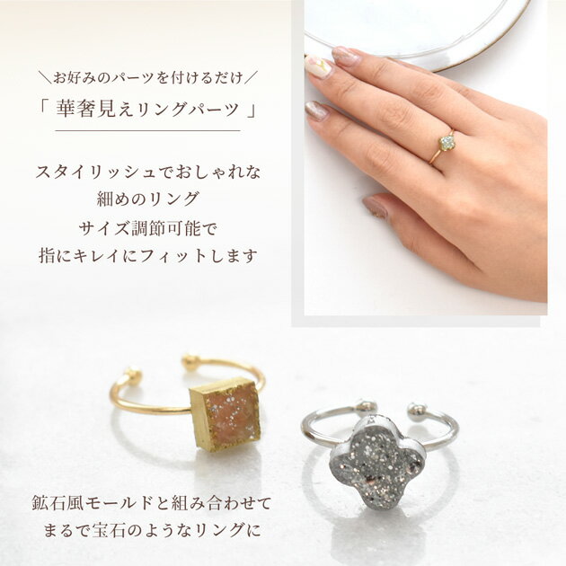 ★ 3,980円以上ご注文で、宅配便・ゆうパケット 送料無料 ★【1】日本郵便 ゆうパケット(メール便) 全国一律 280円■ポストへのお届け(盗難、未投函などの補償なし。日時指定不可。)■厚み3cm、3辺合計60cm以内まで★規定サイズ内に収めるコツ★商品名上に記載の 「#ゆうパケ○点可」 の数字をご参考に、上手にお買い物なさってください。※同一商品を注文した場合、何点まで入るかの目安の数字となります。【下記の場合、宅配便に変更させていただきます↓】・規定サイズを超える場合★同時に送料も変更させていただきます。■「ゆうパケット送料無料」と記載のある商品で、送料無料希望の方はゆうパケットをご選択ください。ただし、「ゆうパケット送料無料」商品をご注文でも、宅配便希望の場合は、宅配便をご選択ください(送料の差額が発生します)。------------------------【2】日本郵便 ゆうパック(宅配便) 全国一律 650円日時指定OK!■3,980円以上のお買い上げでも、配送方法「ゆうパケット」希望にチェックがある場合は、ゆうパケットでのお届けとなります。【ゆうパケット・ゆうパック共通注意事項】※ご注文後に、複数通に分けてのご発送はできかねます。■ロット(生産時期)が異なると、同じ品番のものでもカラー、サイズ、品質が変わります。同じ種類、材料、染料を用いても製造過程において完璧に同じものを再現することが難しく、このような現象はどの商品にも見られます。 詳しくはこちら→前回とは色や幅が異なるという理由での、返品交換はお断りをしていますのでご理解ください。■領収書、明細書は同封しておりません。(エコ、個人情報保護、配送のスピード化などの理由によるため)【1】領収書商品発送後、購入履歴画面の「領収書を発行する」ボタンからPDFで発行できます。(※後払い決済を除く)▼下記の場合は、領収書の発行は出来ません。【後払い決済】運収納印のある払込受領書が公的な領収書となります。【クレジット】お客様ご契約のクレジット会社が発行するご利用明細書が代わりとなります。【コンビニ決済】払込受領証が領収書となります。【全額ポイント支払い】ご請求金額が0円のため発行できません。------------------------【1】明細書▼明細書をお入れしておりません。・「ご注文確定メール」が明細書の代わりとなります。・楽天会員様はご購入履歴からもご確認いただけます。------------------------当店からのメールを必ず受信していただきますよう、「ドメイン指定受信解除」していただきますようお願いいたします。(my-mama@d5.dion.ne.jp と、 auc-my-mama@shop.rakuten.co.jp)【1】商品のカットに関しまして・生地、ブレード、ゴム等、長さを指定してのカットのご依頼はお受けできかねます。(例:1Mを5枚に分けて、1M・2Mを1枚ずつ、など)・カット販売の商品に関しましては、ご注文いただいた数量をつながった状態でお届け致します。(ご注文数が多い場合は途中でカットしたものをお届けする場合がございます。)台座付きリングパーツ 全2色フリーサイズ 2個入り台座にお好みのパーツを組み合わせるだけで簡単にオリジナルの指輪が作れるリングパーツ。レジンで作った天然石や鉱石風のモチーフやお花のカボションを付けても◎組み合わせるパーツ次第でさまざまな印象の作品に仕上がります。サイズが調節できるフリーサイズなので指にもしっかりフィット!シンプルで華奢なデザインは指を美しく上品に輝かせます。こちらは2個セットの単品販売ページです。 お得な卸販売はこちらからサンプルで使用したシリコンモールドはこちらから▼MYmamaオリジナルシリコンモールドドゥルージー【商品詳細】■商品番号【3773-1】ゴールド【3773-2】シルバー■サイズ・台座:約6mm 厚み:約0.6mm・リングの内径:約14~19mm※フリーサイズですので調節してご使用ください。詳細は画像をご確認ください。 ■素材銅 ■個数2個 ■ゆうパケット100点まで可■ご注意・小キズやスレ、色ムラがある、台座の中心にズレがある場合がございます。・リングの形に歪みがある場合がございます。その場合は手で優しく形を整えてご使用ください。 ・フリーサイズとなっておりますが、過度に力をかけますと破損の原因となりますので使用の際はご注意下さい。・できる限り実物のお色に近づけるよう心掛けておりますが、画像では100%同じお色を表現することが出来ません。実際のお色味より若干異なる場合がございます。・生産ロットにより、サイズ・カラーが若干異なる場合がございます。前回お買い上げの商品と異なる場合がございます。 ・アクセパーツ類の汗や皮脂汚れによる変色は完全に避けることはできません。 ご使用後は必ず汗や汚れをつけたまま保管せぬようご注意ください 上記の理由での返品・交換を承ることは出来ません。■おすすめカテゴリ・その他のリングパーツはこちら・その他のアクセサリー材料はこちらから▼ サイズをご確認ください ▼▼ カラーをお選びください ▼\ ご確認