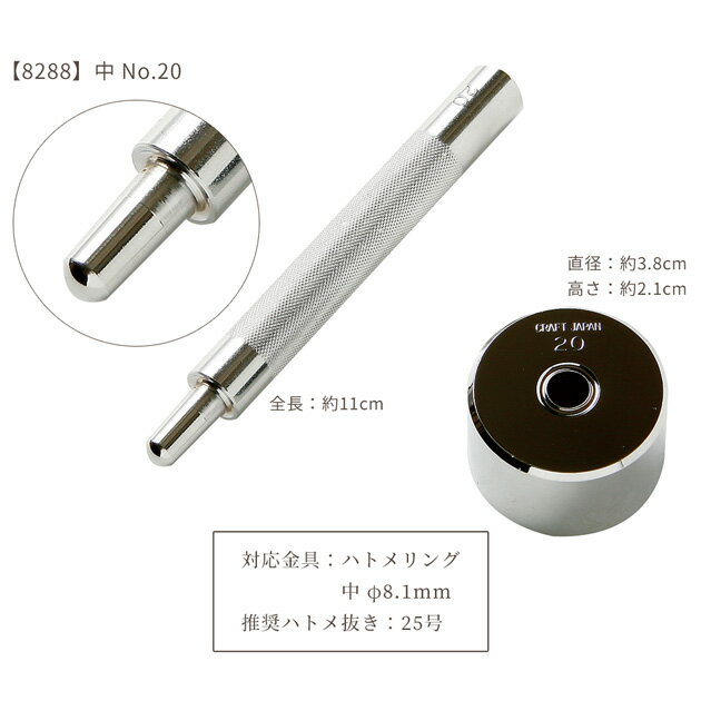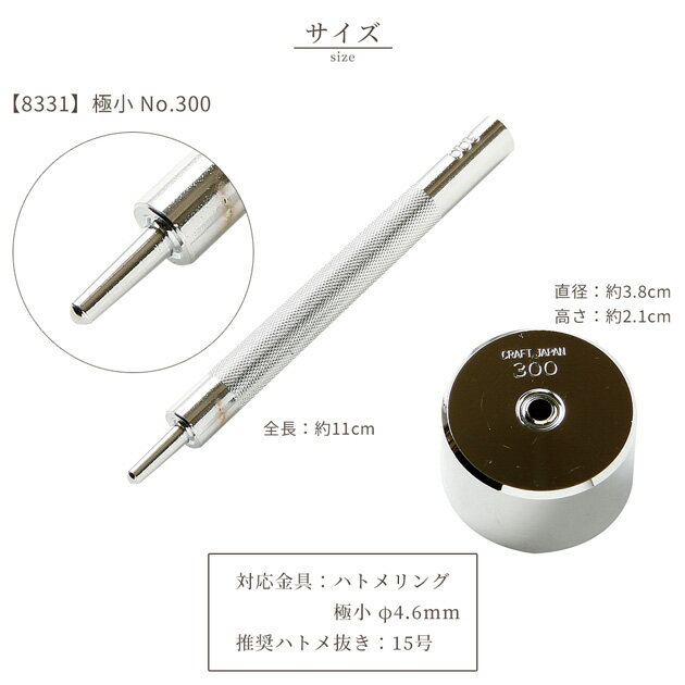★ 3,980円以上ご注文で、宅配便・ゆうパケット 送料無料 ★【1】日本郵便 ゆうパケット(メール便) 全国一律 280円■ポストへのお届け(盗難、未投函などの補償なし。日時指定不可。)■厚み3cm、3辺合計60cm以内まで★規定サイズ内に収めるコツ★商品名上に記載の 「#ゆうパケ○点可」 の数字をご参考に、上手にお買い物なさってください。※同一商品を注文した場合、何点まで入るかの目安の数字となります。【下記の場合、宅配便に変更させていただきます↓】・規定サイズを超える場合★同時に送料も変更させていただきます。■「ゆうパケット送料無料」と記載のある商品で、送料無料希望の方はゆうパケットをご選択ください。ただし、「ゆうパケット送料無料」商品をご注文でも、宅配便希望の場合は、宅配便をご選択ください(送料の差額が発生します)。------------------------【2】日本郵便 ゆうパック(宅配便) 全国一律 650円日時指定OK!■3,980円以上のお買い上げでも、配送方法「ゆうパケット」希望にチェックがある場合は、ゆうパケットでのお届けとなります。【ゆうパケット・ゆうパック共通注意事項】※ご注文後に、複数通に分けてのご発送はできかねます。■ロット(生産時期)が異なると、同じ品番のものでもカラー、サイズ、品質が変わります。同じ種類、材料、染料を用いても製造過程において完璧に同じものを再現することが難しく、このような現象はどの商品にも見られます。 詳しくはこちら→前回とは色や幅が異なるという理由での、返品交換はお断りをしていますのでご理解ください。■領収書、明細書は同封しておりません。(エコ、個人情報保護、配送のスピード化などの理由によるため)【1】領収書商品発送後、購入履歴画面の「領収書を発行する」ボタンからPDFで発行できます。(※後払い決済を除く)▼下記の場合は、領収書の発行は出来ません。【後払い決済】運収納印のある払込受領書が公的な領収書となります。【クレジット】お客様ご契約のクレジット会社が発行するご利用明細書が代わりとなります。【コンビニ決済】払込受領証が領収書となります。【全額ポイント支払い】ご請求金額が0円のため発行できません。------------------------【1】明細書▼明細書をお入れしておりません。・「ご注文確定メール」が明細書の代わりとなります。・楽天会員様はご購入履歴からもご確認いただけます。------------------------当店からのメールを必ず受信していただきますよう、「ドメイン指定受信解除」していただきますようお願いいたします。(my-mama@d5.dion.ne.jp と、 auc-my-mama@shop.rakuten.co.jp)【1】商品のカットに関しまして・生地、ブレード、ゴム等、長さを指定してのカットのご依頼はお受けできかねます。(例:1Mを5枚に分けて、1M・2Mを1枚ずつ、など)・カット販売の商品に関しましては、ご注文いただいた数量をつながった状態でお届け致します。(ご注文数が多い場合は途中でカットしたものをお届けする場合がございます。)クラフト社ハトメリング打 極小 No.300 / 中 No.20全2サイズハトメリングを取り付けるための打ち具皮革にセットした金具を打台の溝に合わせ打具を差し込み、木槌で数回叩いて打ち込みます。布小物やレザークラフトにいかがですか・・・【商品詳細】■商品番号極小 No.300【8331】、中 No.20【8288】■サイズ打具:全長 約11cm打台:直径 約3.8cm 高さ 約2.1cm■個数1組■素材鉄■ゆうパケット極小:4点まで可能中:3点まで可能■対応金具ハトメリング 極小 No.300 φ4.6mm、ハトメリング 中 No.20 φ8.1mm■推奨ハトメ抜きハトメ抜き 15号 (4.5mm)、ハトメ抜き 25号 (7.5mm)■ご注意・小キズがある場合がございますが、製造時につく避けられない現象となります。・乳幼児の手の届かない場所に保管してください。・生産ロットにより、お色やサイズが若干異なる場合がございます。・画像では100%同じお色を表現することができません。実際のお色味と若干異なる場合がございます。上記理由に関しましての返品・交換は承ることが出来ません。予めご了承の上、お買い求めお願い申し上げます。■おすすめカテゴリその他のカシメ・工具などはこちらからその他のホックはこちらからクラフト社 金具と打ち具の適合表品番 金具推奨ハトメ抜き品番 打具1161 ハトメリング No.300 極小15号8331 ハトメリング打 No.300 極小1165 ハトメリング No.20 中25号8288 ハトメリング打 No.20 中1167 ハトメリング No.23 大30号8289 ハトメリング打 No.23 大1169 ハトメリング No.25 特大30号8290 ハトメリング打 No.25 特大ご一緒にいかがですか♪ミニゴム板 正角木槌 タイコクラフト社製品はこちらレザークラフト関連商品はこちら