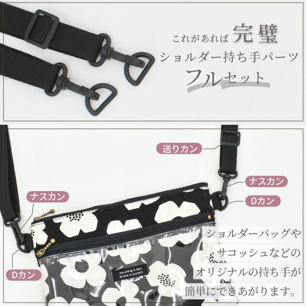 ★ 3,980円以上ご注文で、宅配便・ゆうパケット 送料無料 ★【1】日本郵便 ゆうパケット(メール便) 全国一律 280円■ポストへのお届け(盗難、未投函などの補償なし。日時指定不可。)■厚み3cm、3辺合計60cm以内まで★規定サイズ内に収めるコツ★商品名上に記載の 「#ゆうパケ○点可」 の数字をご参考に、上手にお買い物なさってください。※同一商品を注文した場合、何点まで入るかの目安の数字となります。【下記の場合、宅配便に変更させていただきます↓】・規定サイズを超える場合★同時に送料も変更させていただきます。■「ゆうパケット送料無料」と記載のある商品で、送料無料希望の方はゆうパケットをご選択ください。ただし、「ゆうパケット送料無料」商品をご注文でも、宅配便希望の場合は、宅配便をご選択ください(送料の差額が発生します)。------------------------【2】日本郵便 ゆうパック(宅配便) 全国一律 650円日時指定OK!■3,980円以上のお買い上げでも、配送方法「ゆうパケット」希望にチェックがある場合は、ゆうパケットでのお届けとなります。【ゆうパケット・ゆうパック共通注意事項】※ご注文後に、複数通に分けてのご発送はできかねます。■ロット(生産時期)が異なると、同じ品番のものでもカラー、サイズ、品質が変わります。同じ種類、材料、染料を用いても製造過程において完璧に同じものを再現することが難しく、このような現象はどの商品にも見られます。 詳しくはこちら→前回とは色や幅が異なるという理由での、返品交換はお断りをしていますのでご理解ください。■領収書、明細書は同封しておりません。(エコ、個人情報保護、配送のスピード化などの理由によるため)【1】領収書商品発送後、購入履歴画面の「領収書を発行する」ボタンからPDFで発行できます。(※後払い決済を除く)▼下記の場合は、領収書の発行は出来ません。【後払い決済】運収納印のある払込受領書が公的な領収書となります。【クレジット】お客様ご契約のクレジット会社が発行するご利用明細書が代わりとなります。【コンビニ決済】払込受領証が領収書となります。【全額ポイント支払い】ご請求金額が0円のため発行できません。------------------------【1】明細書▼明細書をお入れしておりません。・「ご注文確定メール」が明細書の代わりとなります。・楽天会員様はご購入履歴からもご確認いただけます。------------------------当店からのメールを必ず受信していただきますよう、「ドメイン指定受信解除」していただきますようお願いいたします。(my-mama@d5.dion.ne.jp と、 auc-my-mama@shop.rakuten.co.jp)【1】商品のカットに関しまして・生地、ブレード、ゴム等、長さを指定してのカットのご依頼はお受けできかねます。(例:1Mを5枚に分けて、1M・2Mを1枚ずつ、など)・カット販売の商品に関しましては、ご注文いただいた数量をつながった状態でお届け致します。(ご注文数が多い場合は途中でカットしたものをお届けする場合がございます。)▲サコッシュ手作りキットを参考に合わせてみました! \ 組み合わせて使える持ち手テープはこちらから /PPテープ ブラック 全6サイズその他4色 全3サイズ デザイン ロゴ &無地持ち手テープ 2色×4サイズ15mm / 25mm / 30mm / 38mm太め 持ち手 テープ デザイン ロゴ 50mm 幅 長さ 約2.5m 全2色\ パーツごとの販売はこちらから /プラスチック ナスカン ブラック全7サイズ プラスチック Dカン ブラック全7サイズベルト送り コキカン ブラック全6サイズ【卸売り】プラスチック ナスカン ブラック全7サイズ 【卸売り】プラスチック Dカン ブラック全7サイズ【卸売り】ベルト送り コキカン ブラック全6サイズ\ メタル素材のセットはこちらから /ショルダーパーツセット15mm / 20mm / 25mm / 30mm/ 38mm全5サイズ/全3色 【卸売り】ショルダーパーツセット15mm / 20mm / 25mm / 30mm/ 38mm全5サイズ/全3色/10組入 【単品/卸売り】プラスチック ショルダーパーツセット ブラック15mm/20mm/25mm/30mm/38mm/50mm 全6サイズ単品1組入/卸売り10組入パーツをひとつひとつ集める手間なし!ショルダー持ち手に必要なナスカン・Dカン・送りカンが揃った、便利なショルダーパーツのフルセットです。カンを通して縫うだけでお好みのテープでオリジナルのショルダー持ち手ができあがります。 プラスチック素材で軽くて丈夫なのも嬉しいポイント。どんなデザインにも合わせやすいシンプルなブラックで、性別問わずご使用いただけます。サイズも15mm~50mmと6サイズございますのでバッグやサコッシュはもちろん、お子さまの水筒カバーのショルダーなどの通園、通学グッズにもおすすめです。 \ 作り方動画も公開中 /【商品詳細】■商品番号■単品【4696-15】 15mm 【4696-20】 20mm 【4696-25】 25mm【4696-30】 30mm 【4696-38】 38mm 【4696-50】 50mm■卸売り【224696-15】 15mm 【224696-20】 20mm 【224696-25】 25mm【224696-30】 30mm 【224696-38】 38mm 【224696-50】 50mm■素材プラスチック■サイズナスカン、Dカン、送りカンの内径約15mm/約20mm/約25mm/約32mm/約38mm/約50mm※その他詳
