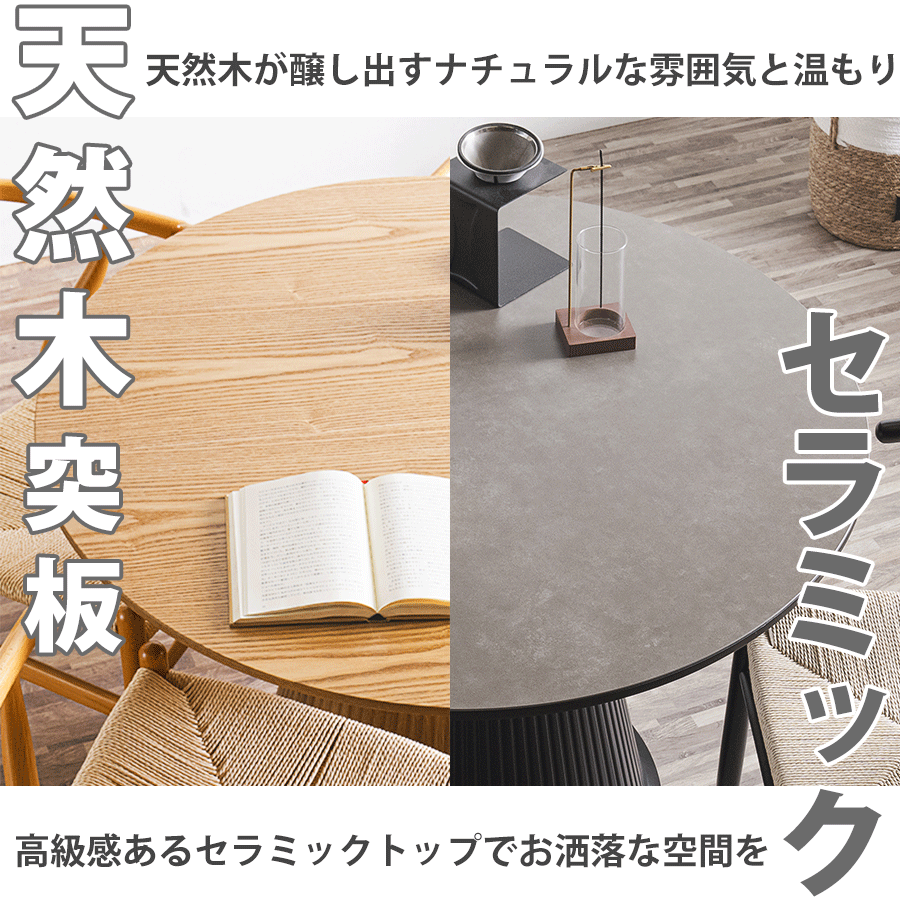 【商品の特徴】セラミックダイニングテーブルは、耐久性とデザイン性を兼ね備えたモダンテーブルです。 セラミック素材は、熱や傷に強い特性を持っているため、日常使いでの耐久性が非常に高いです。 また、水や油、その他の液体が染み込みにくいので、お手入れが簡単という利点もあります。 デザイン面では、セラミックテーブルは様々な色や模様が可能で、光沢のある仕上がりからマットな質感まで、多様なスタイルを選ぶことができます。これにより、現代的な空間にも、もっと伝統的なダイニングルームにもしっくりくるデザインが見つかります。スタイリッシュで実用的なセラミックダイニングテーブルは、現代家庭における洗練された選択と言えるでしょう。 【こんな方へお勧め】新築 新居 引っ越し 一軒家 マンション アパート テーブル買い替え 模様替え リニューアル 開店 開業 オープン 店舗 【こんな空間にお勧め】一戸建て 一軒家 ダイニング LDK 台所 事務所 店舗 受付 会議室 カフェ ダイニングルーム リビングルーム オープンスペース 【こんな方への贈り物としてもおすすめです】女性 男性 お父さん お母さん 兄弟 姉妹 子供 大家族 一人暮らし 2人家族 3人家族 4人家族 5人家族 6人家族 おばあちゃん おじいちゃん 祖父 祖母 奥様 新婚 先輩 後輩 親戚 取引先 20代 30代 40代 50代 60代 70代 80代 90代 【こんなワードで検索されます】セラミックテーブル セラミックダイニングテーブル 丸型 セラミックテーブル丸 天然木 木製 ダイニングテーブル スペイン産セラミック 最高峰 高級 食卓テーブル テーブル デザインセラミックテーブル モダンセラミックテーブル セラミックトップ セラミック天板 天板 ダイニング 幅 奥行 高さ 100cm 74cm 4人掛け 石目調 円形 ヘリンボーン スタイル ラウンドテーブル カフェテーブル ホワイト グレー ダークグレー ブラック シック モダン 高級 おしゃれ 机 4人用 3人用 2人用 1本脚 耐熱 耐摩擦 防水 紫外線抵抗 耐薬品 耐凍害 強化ガラス スチール メーカー希望小売価格はメーカーカタログに基づいて掲載していますバリエーション 【木製/セラミック】100cmナチュラル/ブラウンホワイト/グレーテーブルのみ44,800円/54800円 【木製】100cm ナチュラル/ブラウン3点セット86,800円~ 【木製】100cm ナチュラル/ブラウン5点セット128,800円~ 丸テーブルシリーズ 【木製/セラミック】100cmナチュラル/ブラウンホワイト/グレーテーブルのみ44,800円/54800円 【木製】110cm ナチュラル/ブラウンテーブルのみ48,000円 【木製/セラミック】120cm ナチュラル/ブラウンホワイト/ダークグレー/アッシュグレーテーブルのみ48,000円 【セラミック】90cm ホワイト/グレー/ダークグレーテーブルのみ29,800円 【スペイン産セラミック】100cm ホワイト/グレーテーブルのみ35,800円 【セラミック】90cmホワイト/ダークグレー>リビングテーブル34,800円 ターンテーブルも販売中です商 品 情 報材 質ナチュラル/ブラウン:天然木突板/脚:強化シート(木質感のある手触りです)ホワイト:スペイン産 セラミックトップ(3mm)/MDF/脚:強化シート(木質感のある手触りです)グレー:スペイン産 セラミックトップ(3mm)/MDF/脚:樹脂サ イ ズテーブル:直径100cm×高さ73.5cm特 徴選べるラウンドテーブル(カペラ/ミモザ)■セラミック天板は、セラミック3mm/MDF■天板はナチュラル(木製)/ブラウン(木製)/ホワイト(セラミック)/グレー(セラミック)からお選びください ■抗菌マットをご希望の場合は、ご注文時にご選択ください (楽天のシステム上、自動加算とはなりませんので、受注確認後こちらで金額訂正を行います ■木製天板もセラミック天板も鏡面仕上げではございません素材そのものの手触り・触感を味わえます■木製天板の場合、マイクロファイバー仕様のタオルは多少引っかかる場合がございます。■天板の柄は写真とは異なる場合がございますのでご了承ください■3梱包でのお届けとなります 3-1天板(約)107cm×8.5cm×108cm ナチュラル/ブラウン:(約)16kgホワイト/グレー:(約)21kg3-2支柱(約)56cm×56cm×72cm(約)12kg3-3中板/土台(約) 60cm×61cm×10cm (約)7kg■お客様組み立て品(簡単なネジ止め)■重量がありますので必ず2名以上で取り扱いをお願いします■こちらはテーブル単品の販売です(チェアは別売りです)■中国製※製造工程により納期がかかる場合がございます。ご了承ください。 ※モニターの発色の具合によって実際のものと多少色が異なる場合があります。ご了承ください。※写真上の付属品は商品に含まれません。 ※メーカー在庫のため、納期がかかる場合や急な売り切れがございます。予めご了承下さい。