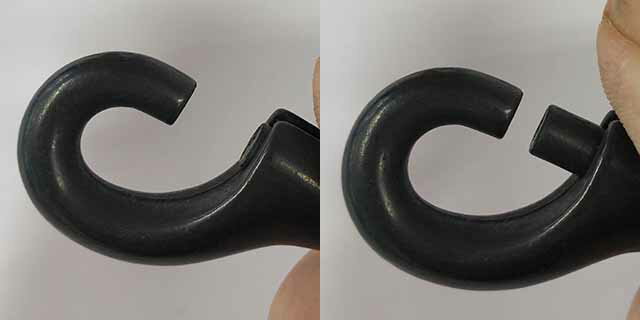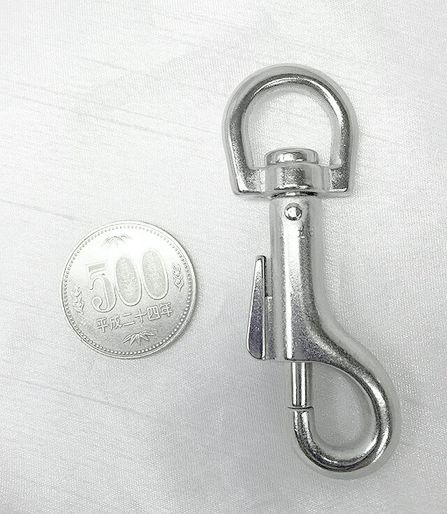 にのきんショップのナスカン/開閉するDカンは、開閉回転チェック後発送。済マークがついてます。 品番 サイズ(mm) 全長(L) 内径横(d) 内径縦(H) 線径(D) 開閉(S) フック内径(t) フック外径(W) 重量(g) 15m-dtt 15mm丸 76.0 15.5 10.8 4.8 8.0 8.5 20.4 38.0 w18-dxs 18mm丸 78.8 18.5 13.6 4.8 8.0 8.5 20.4 38.5 w24-dxs 24mm丸 88.1 25.3 21.6 5.5 8.0 8.5 20.4 43.9 w21-dxs 21mm 72.2 21.5 7.7 4.0 8.0 8.5 20.4 36.2 w24-dxs 24mm 72.4 24.5 7.9 4.0 8.0 8.5 20.4 36.8 w30-dxs 30mm 74.2 30.6 9.4 4.0 8.0 8.5 20.4 39.9 w40-dxs 40mm 72.5 40.3 7.8 4.0 8.0 8.5 20.4 39.9 w50-dxs 50mm 74.5 49.4 8.1 4.0 8.0 8.5 20.4 51.0 材質:亜鉛合金ダイキャスト/原材料・加工・メッキ全て日本製。 *ナスカンは消耗品です。フックやネジが緩んできたら、交換してください。耐荷重150kgのナスカン、大 止め鉄砲ナスカン。シルバー ゴールド ダールブラック マットブラック にのきんマークには重要なデータを表記しています。 このナスカンは大型犬用です。耐荷重的には1/5にして31kg以下のわんこに適用です。ご検討ください。 耐荷重150kgf、安心安全な日本製ナスカン、大止め鉄砲ナスカンシルバー。15mm丸/18mm丸/24mm丸/21mm/24mm/30mm/40mm/50mmの8サイズがあります。胴部もしっかりしていて、直径10mmもあります。ナスカンの中では、かなり太いタイプですね。まず、壊れる事ない安心のナスカンです。 100個セットの方は受注生産です。納期は90日ほど。(マットブラックは2か月程度かかります。)お急ぎの方は一部即納も可能ですので、お電話ください。 ナスカンのサイズが違っても、フックは共通で同じ物を使用してます。(画像はダールブラックを使用してます。) レバーを手前に引いて、開閉します。開閉は軽めなので、気になる方は強バネをご選択下さい。(画像はダールブラックを、使用してます。) 「止め」鉄砲ナスカンの「止め」って何?と疑問に思でしょう。実はこの赤丸の中が答えです。リベットで両側を打ち付けて支えてるのです。これで抜けにくくなり、耐荷重を高めてます。このリベットよく見ると、頭の大きさが微妙に違ってます。表と裏の違いを出したかったのですが、分かりにくくて申し訳ありません。 三角形のフックレバーは、この止め鉄砲ナスカンだけです。これも特徴ありますね。開閉は軽めなので、気になる方は強バネをご選択下さい。 外径26.5mmの500円玉との比較です。大方の大きさが掴めるかと思います。