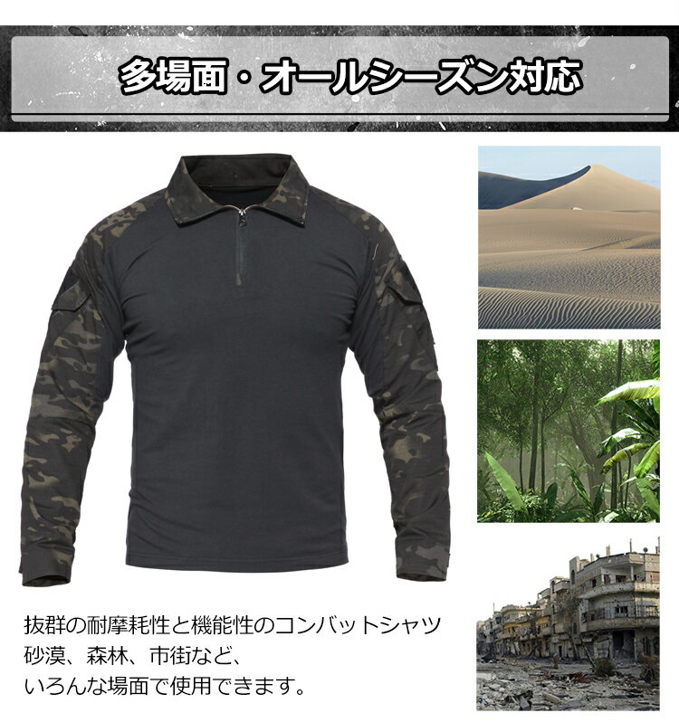 ●Combat(戦闘)、Shirt(シャツ) コンバットシャツとは数ある戦闘服(BDU)のうちのひとつで、 アメリカ軍では正式に採用されています! このメリハリの効いたデザインのおかげで タクティカルベスト類を装着しても通気性がよくて快適です。 戦闘に特化した合理的なシャツと言えます。 特にプレートキャリアとの相性はかなりいいです。 ●多場面・オールシーズン対応 抜群の耐摩耗性と機能性のコンバットシャツ 砂漠、森林、市街など、いろんな場面で使用できます。 ●素材 素材:棉+ポリウレタン 棉の生地は柔らかく、快適です。通気性と吸湿性が優れてます。 ポリウレタンを採用しますから、布地に良い伸縮性を与えます。 素肌に直に着る時に束縛感はまったくありません。 春、夏、秋、冬とオールシーズン使用可能です。 ●胴部分は柔らかく伸縮性のある素材を使用しています。通気性と吸湿性もあり、暑い季節はもちろん通年使用もOK。 アームカバーと合わせたり、アウトドアジャケットのインナーとして重ね着にも使えます。 ●脇、二の腕のところも方面は伸縮生地になっているので、腕を動かした際にも突っ張らず、運動性が良くなります。 ●両袖のポケットにはベルクロが付いており、好みのワッペンを付けたり、サバゲーでのチームカラーのワッペンをつけることなどもできます。 ●伸縮性あり ●肩ポケット上にベルクロが付いています ●優れた汗吸性 ●カラー:ブラック(BK) マルチカム(MC) マルチカムブラック(MCBK) オリーブ タイフォン ●サイズ:S/M/L/XL Sサイズ 着丈65CM、肩幅45CM、胸囲92CM~(伸縮性あり)、袖丈54CM Mサイズ 着丈67CM、肩幅47CM、胸囲96CM~(伸縮性あり)、袖丈55CM Lサイズ 着丈69CM、肩幅49CM、胸囲100CM~(伸縮性あり)、袖丈56CM XLサイズ 着丈71CM、肩幅51CM、胸囲104CM~(伸縮性あり)、袖丈57CM 注: ▲写真撮影の際、光の関係で画像と実物の色合いが違うことが御座います。 ▲モデルは身長178cm、体重75KGで、Lサイズ着用。