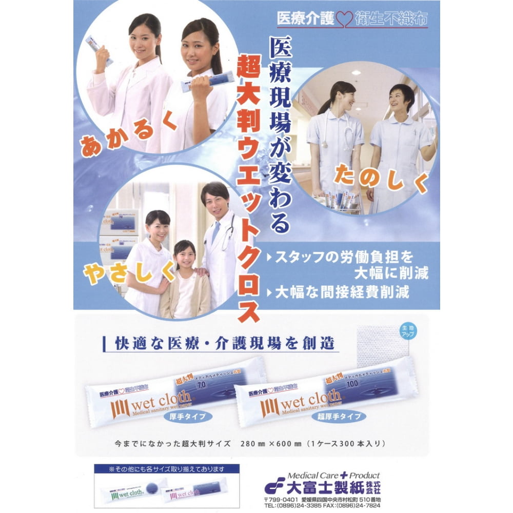 ご注意 ●この商品は、取り寄せ後の発送となります。通常5営業日以内に発送いたします。 特長 医療・介護用ウエットシート超大判 衛生不織布 ●大きなサイズとボリュームのウェットティッシュなので、1枚でらくらく全身の清拭ができます。 ●塩素を除去しているので、嫌な刺激臭がなく、軟水を使用しているので、肌にやさしく安心です。 ●高い殺菌力・低刺激性・消臭効果のある、安定化二酸化塩素を防腐剤に使用。 ●メッシュ構造なので、ガラスレンズ等に付着したホコリや汚れを綺麗に拭きとれます。 ●ボリュームのある素材なので、お尻拭きに使っても裏移りの心配がありません。 ●どんなシーンで使っても、破ける心配がありません。また、真綿のような柔らかさです。 ●電子レンジやホットキャビで温めての使用が可能です。 用途 ●入浴できない方の身体拭きに! ●身体拭き以外にも診察台の清掃や医療器具の拭き取りなど、新しい使い方をどんどん見つけ、現場環境の改善にお役立ていただけます。 商品詳細 商品名業務用 医療・介護用ウェットタオルメディカルメティッシュ 丸型 超大判70(厚手) 原紙素材レーヨン・PET 原紙厚み70g/1m2 原紙寸法280×600mm 入数300本 生産国日本 メーカー名大富士製紙株式会社 【広告文責】株式会社コーセイ 087-885-6107