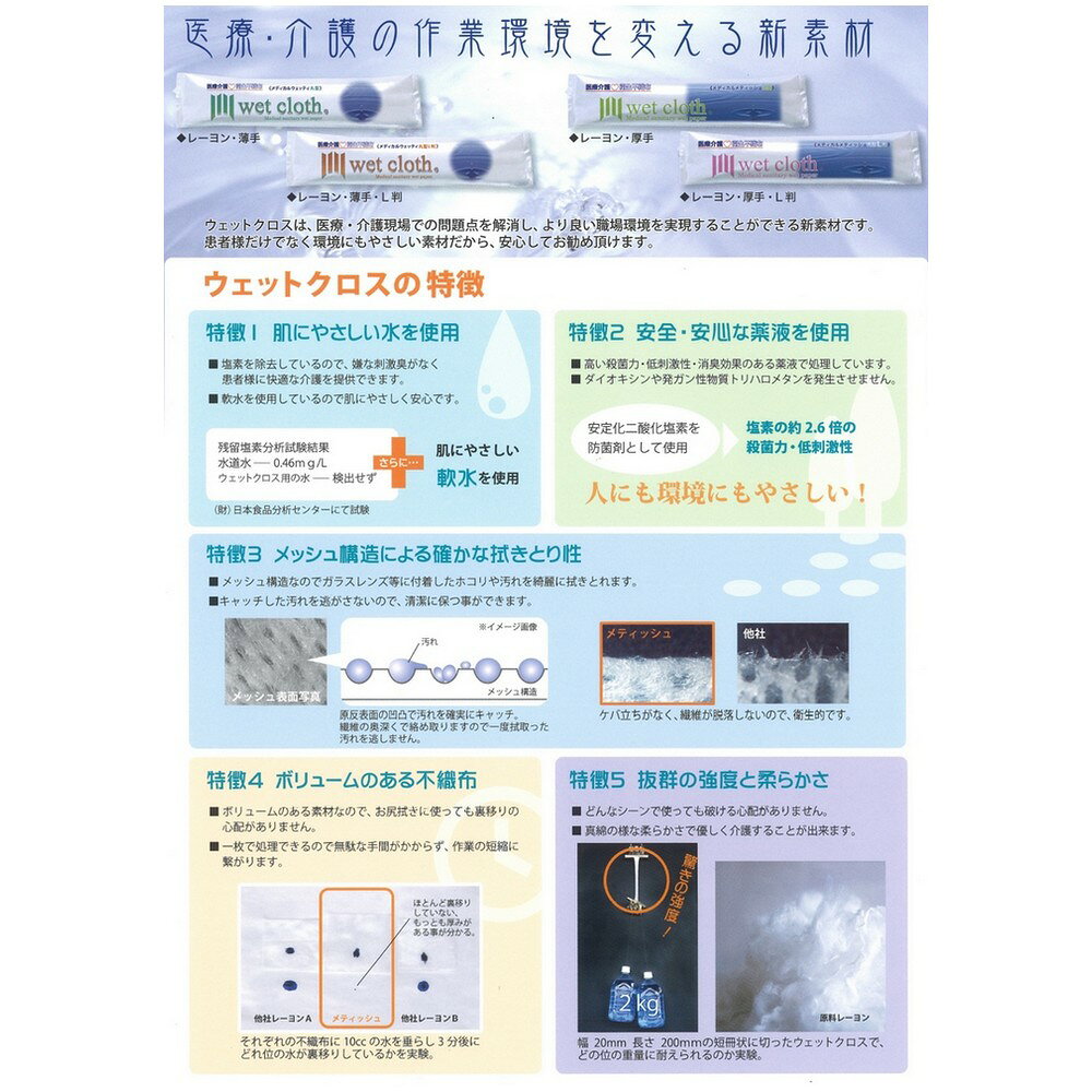 ご注意 ●この商品は、取り寄せ後の発送となります。通常5営業日以内に発送いたします。 特長 医療・介護用ウエットシート 衛生不織布 ●薄手だから細かな拭き取りに便利。 ●抜群の強度と柔らかさのしっかりとしたレーヨン不織布タイプ。 ●手拭き・顔拭きにおススメのサイズ。 ●ノンアルコール・無香料。 ●塩素を除去しているので嫌な刺激臭がなく、軟水を使用しているので肌にやさしく安心です。 ●高い殺菌力・低刺激性・消臭効果のある、安定化二酸化塩素を防腐剤に使用。 ●メッシュ構造なので、ガラスレンズ等に付着したホコリや汚れを綺麗に拭きとれます。 ●個包装なので衛生的。 ●電子レンジやホットキャビで温めての使用が可能です。 用途 ●医療・介護現場でのご使用。 ●お食事前のお手拭き、食堂での拭き取りに。 ●診察台の清掃や医療器具の拭き取りなど。 ●家庭・職場・アウトドア等でもご活用いただけます。 商品詳細 商品名業務用 医療・介護用ウェットタオルメディカルウエッティ 丸型(薄手) 原紙素材レーヨン・PET 原紙厚み38g/1m2 原紙寸法280×180mm 入数1200本 生産国日本 メーカー名大富士製紙株式会社 【広告文責】株式会社コーセイ 087-885-6107
