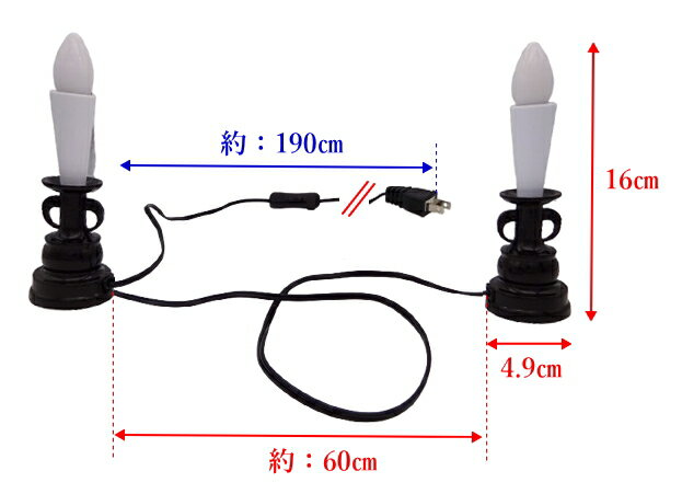 LED電気ローソク 2本立 手元スイッチ付 コード式(コンセント)ですので、電池の交換は必要ありません。 コンセントに挿すだけで簡単点灯! LED電球なので熱を持たず安心・安全・長持ち! 火を使わないので倒れても安心です。 電池式が主流ですが、LED球を使用して経済的、そして耐久的に変化した商品です。 【注意】 ・ローソクや線香などの火元に近づけないでください。 ・お休み前や外出時などには、必ずコンセントを抜いてください。 ・附属電球の規格以外のものは使用しないでください。 ・コードは折ったり、重い物の下に敷かないでください。ショートや火災の原因となります。 ------------------------------------- ■材質■ 本体・ローソク部分:PC製 ■機能・性能■ 2本式 コード式 手元スイッチ付 LEDローソク球:E12 100V 0.5W ※球切れの際はホームセンター等でお買い求めください。 ※球は規格以外の物は使用しないでください。 ■サイズ■ 高さ(ローソク球含む):16cm 台底直径:4.9cm コードの長さ:ローソク灯間 約60cm コンセントまで 約190cm ■生産国■ 中国製 ------------------------------------- ★LEDローソク 1本立は【こちら】へ!! ★他 ローソクは【こちら】へ!!