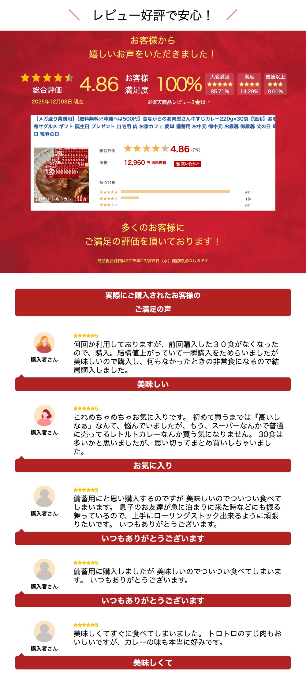名称 カレー原材料名 牛肉、小麦粉、ラード、たまねぎ、砂糖、カレー粉、食塩、チャツネ、リンゴピューレ、ビーフエキス、醤油、トマトペースト、乳等を主要原料とする食品、ウスターソース、生姜ペースト、ニンニクペースト、牛脂/調味料(アミノ酸等)、着色料(カラメル、カロチン)、香辛料抽出物、酸味料、香料(一部に小麦・乳成分・牛肉・大豆・豚肉・リンゴを含む)販売者株式会社ヒライ 内容量1袋 220g保存方法直射日光をさけ常温で保存してください関連商品昔ながらのお肉屋さん牛すじカレー220g×2袋【メール便ネコポス】お取...【送料無料※北海道・沖縄へは+500円】★ギフト用★昔ながらのお肉屋さ...【業務用】【送料無料※沖縄へは500円】昔ながらのお肉屋さん牛すじカレ...1,000円2,980円4,860円タマゴをのせてまろやか旨さのキーマカレー(辛口) 180g×2袋【メー...【業務用】【送料無料※沖縄へは+500円】タマゴをのせてまろやか旨さの...【高級缶詰】神戸牛ビーフカレー200g 神戸ビーフ 高級肉 ギフト 誕...1,000円4,860円1,080円【即日出荷対応】【送料無料※北海道・沖縄へは+500円】神戸牛 赤身 ...【即日出荷対応】神戸牛ロース すき焼き しゃぶしゃぶ 500g(2〜3...【即日出荷対応】【送料無料※北海道・沖縄へは+500円】神戸牛 赤身 ...11,800円14,040円11,800円【即日出荷対応】★すじコロ★すじころコロッケ 5個 【冷凍】...【即日出荷対応】【当店手づくり】昔ながらのお肉屋さんのハムカツ5個(冷...【即日出荷対応】【肉の日限定価格】昔ながらのお肉屋さんのハムカツ 5個...800円810円702円牛すじカレー10食 キーマカレー10食 牛すじカレー30食 ボリュームたっぷり!!当店自慢の牛スジ肉をたっぷりと使用。 牛スジをじっくり煮込むことで、さらに風味や旨味を出し、トロトロになった牛すじがカレーと見事にコラボしました。中辛なのに、牛スジの旨味でとってもまろやかな仕上がりに。知らずに食べればレトルトと気づかれないほどの本格派! 通常よりボリュームがあり、期待できる美味しさです◎