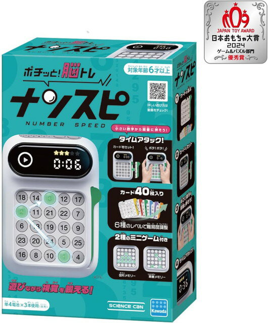 お支払い方法・送料・配送について予約販売商品についてナンスピ (脳トレ ボードゲーム パーティーゲーム テーブルゲーム)ポチっと脳トレ!老若男女が遊び感覚で脳を鍛えられる脳トレトイ!いつでもどこでも楽しく集中力や注意力、記憶力を鍛えられるコンパクトサイズゲーム!視線をボードの中央に集中させることで、周辺視野を広げるトレーニングにも!●ボタンの音と感触がたまらない!何度もトライしたくなる!ミスなく全てのボタンを押せた時の達成感がすごい!●3つのモードで飽きさせない!遊び方は超簡単!早押しモード:カードを挿入してスタートボタンを押し、数字が小さいものから順にボタンを押す!早さを競うタイムアタック!順番メモリーモード:スタートボタンを押し、点滅するライトの順番と位置を記憶して再現する。3回間違えると失敗!図形メモリーモード:スタートボタンを押し、ボタンが点灯した全ての位置を記憶して再現する。3回間違えると失敗!■対象年齢:6歳以上■使用電池:単4電池×3本■メーカー:カワダ(Kawada)