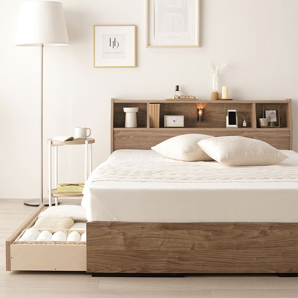 ■サイズ・色違い・関連商品関連商品の検索結果一覧はこちら■商品内容【国産高品質/Japan High Quality/日本製/Made in JAPAN】・照明&棚付きヘッドボード くつろげる空間を演出する照明とコンセント付きヘッドボード・2杯の引き出し収納 取り外し可能な間仕切り板がついた便利な引き出し収納 ※ヘッド側の引き出しのみ・安心の国産品質 細部まで作りこみ、低価格でありながら高品質なベッド■照明付きでくつろぎの空間へ夜中に起きても手元や棚を照らすので安心■モダンで機能的な2段棚ヘッドボード・1口コンセント付き 枕元で携帯の充電ができ、配線のごちゃつきもなし。 ※コンセントは全サイズ、右側に1200W×1口付きます。■置きたいものが置けるサイズ設計・奥行は約17cm。文庫本が置けるサイズ。・ティッシュ箱を置くのにもちょうどいい。■2杯の便利な引き出し収納付き取り外し可能な間仕切り板付き※ヘッド側の引き出しのみ・底板の裏は桟でしっかり補強 引き出しの底が抜けないように桟をつけた仕様です。・引き出しの反対側は大きなフリースペース・引き出しは左右どちらにも取り付け可能■高級感のある木目柄と質感・本物を追求した木目デザイン リアルな質感の木目シートを採用し、高級感ある雰囲気に。■Color VariationBlack ブラックBrown ブラウンWhite ホワイトNatural ナチュラルAsh Brown アッシュブラウンVintage Natural ヴィンテージナチュラル■安心の国産品質細部まで作りこみ、低価格でありながら高品質なベッドを実現創業から蓄積された生産技術を駆使し、圧倒的なコストパフォーマンスを発揮ベッドフレームはSGマークで知られる製品安全協会の認定工場で製造低ホルムアルデヒドF☆☆☆☆以上の接着剤・塗料を使用(ボード部分はF☆☆☆?F☆☆☆☆を使用)使い勝手だけでなく安心・安全なベッド■組み立て手順1.ヘッドボードを組み立て2.サイドフレームを連結3.サイドフレームにセンターパネルとフットボードを取り付け4.サイドフレームにヘッドボードを取り付け5.ヘッドキャビネットと引き出しを取り付け ※引き出しは組み立て式となります6.床板を取り付けて完成■厳選したマットレス付きもご用意計5種類からお好きな寝心地のマットレスをお選びいただけます。・日本製ボンネルコイルマットレス・日本製ポケットコイルマットレス・海外製ボンネルコイルマットレス ※外周のみポケットコイルを使用・海外製ポケットコイルマットレス(片面仕様)・海外製ポケットコイルマットレス(両面仕様)【ポケットコイルとボンネルコイルの違い】・ポケットコイルマットレス 独立したコイルが点で身体を支えるため、自然な寝姿勢を保てます。 点で支えて身体にフィット 体圧分散に優れている 横揺れや振動も少なめ・ボンネルコイルマットレス 連結された一本のヘリカル線が面で身体を支えます。適度な弾力が特徴です。 面で支える適度な弾力感 耐久性が高い 通気性に優れ湿気・カビに強い※ご注意事項 ベッドフレームには必ず厚さ15cm以上のスプリングマットレスを乗せてご使用ください。 布団や薄型のマットレスのみでご使用いただいた場合、状況によっては商品の破損を招く可能性がございます。■商品スペック【ベッドフレーム本体】■サイズ(約)シングル:幅101×長さ215×高さ80cmセミダブル:幅121×長さ215×高さ80cmダブル:幅141×長さ215×高さ80cm床板までの高さ:25cm引き出し大(フット側)有効内寸:幅96×奥行46×高さ10cm引き出し小(ヘッド側)有効内寸:幅90×奥行35×高さ10cm■材質プリント紙化粧パーティクルボード■カラーホワイト、ナチュラル、ブラック、ブラウン、アッシュブラウン、ヴィンテージナチュラル■機能白熱灯(10W)1灯1口コンセント(1200W) ※全サイズ右側■生産国日本■梱包サイズ・重量(約) 梱包数:3シングル:(1)102×19×31cm・10kg、(2)102×35×16cm・26kg、(3)102×45×10cm・17kgセミダブル:(1)122×19×31cm・11kg、(2)119×35×16cm・28kg、(3)112×45×10cm・19kgダブル:(1)142×19×31cm・12kg、(2)139×35×16cm・30kg、(3)112×45×10cm・19kg※各サイズ・重量は概算です。■商品に関するご注意・この商品はスプリングマットレスの使用を前提に設計されています。 床板の上に直接乗ったり、薄手のマットレスや布団で使用すると、床板が破損する恐れがあります。・本製品はお客様組立品です。プラスドライバーをご用意ください。 ‐2人以上での組み立てをおすすめします。 ‐商品の組み立て開始前に部材不足、破損がないか必ずご確認ください。 ‐ネジは最初から強く締めず仮止めで組み立ててから最後に増し締めしてください・商品画像は、原則としてダブルサイズを使用しております。 実際の大きさはスペックをご確認ください。・写真の色調はモニターの機種や設定により実際の商品と異なる場合があります。・製品のデザイン・仕様・梱包は予告なく変更することがございます。あらかじめご了承ください。・画像や商品情報には、色違いやサイズ違いの商品が載っている場合がございます。ご注文前に色・サイズ・セ