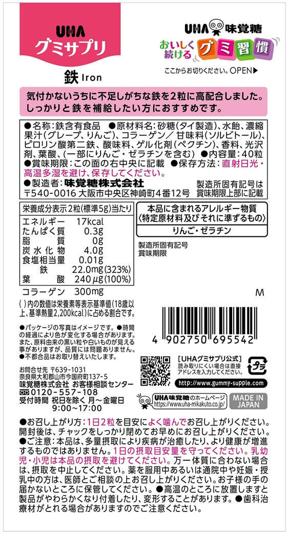 【重要:ご注文について】お客様のご都合による商品の交換・返品・数量変更は一切承っておりません。ご注文の際は慎重にお選びの上、ご注文願います。■ご注文の個数によっては、表示の出荷日目安よりも出荷まで日数を頂く場合がございます。納期については、事前にお問い合わせをお願い致します。また、当該商品は他店舗でも在庫を共有しておりますので、在庫更新のタイミングにより在庫切れの場合、やむを得ずキャンセルさせて頂く可能性があります。【送料について】『同梱区分C : 988円(沖縄・離島 2420円)』※『異なる同梱区分の商品』を一緒にご注文頂いた場合は、同梱が出来ません。別配送となり追加送料がかかりますので、ご注文後に訂正の上、ご連絡させて頂きます。【ご注意】事前の配達日付は一切ご指定頂けません。配達日時につきましては、お手数ですが出荷完了時にご案内する荷物問い合わせ番号をもとに、お客様より配送業者へ直接御調整をお願い致します。メーカーによるリニューアルに伴い、パッケージ・内容等が予告なく変更される場合がございます。掲載写真等がリニューアル前のものであっても、リニューアル後の商品が届いた場合、ご返品や交換等は承ることが出来ません。置き配は破損・汚損・紛失・盗難などの恐れがあるため、原則としてお断りしております。置き配による破損・汚損・紛失・盗難については保証ができかねますので、あらかじめご承知おきください。グミサプリ 鉄 20日分 UHA味覚糖世界基準であるCodex規格に則り、1日の必要参照量である鉄22mgを配合しております。●内容量:40粒(20日分)生産国:日本商品区分:健康食品メーカー:UHA味覚糖※メーカーの都合により、パッケージ・仕様等は予告なく変更になる場合がございます。●広告文責:株式会社プロヴィジョン(tel:092-985-3973)