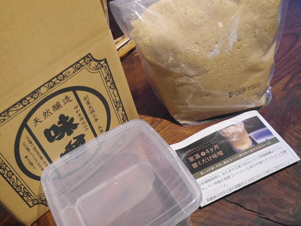 4.5kg入りの置くだけ味噌が2袋入ったお得なセットです。ご友人とシェアなども出来て便利です。 おたまや特注袋に入った。発酵ガスをコントロールして中身の微生物環境も整えます。何といっても重し要らずでカビも生えずらく外気にも触れないので衛生面でもGoodです。 外気に触れないので落下菌、浮遊菌のダメージを受けることなくこの発酵袋Auto Zipperですと暖かい時期5‐10月でも仕込みも可能です。おたまやの『2倍麹 4ヶ月置くだけ味噌 』食べ時は約4ヶ月後からになります。 2L発酵容器も付いて出来上がった味噌を保存容器に小出しをして毎日の食卓でご使用頂けます。袋はチャックと弁のところに付着した場合取り除いて頂ければ何度でもご使用頂けます。こうじザムライ監修の発酵袋 AutoZipperで美味しいお味噌を醸して下さい。袋のみでも販売中です! ※到着後は室温(毎日目の届くところ)に置いてお味噌の『発酵中』経過を確認してほしいです♪ 保存の際は段ボール箱に立てかけて倒れて弁がふさがらないように注意して下さい。 【使い方・お召し上がり方】 ※保存の際(発酵中)はガスの力で袋が動いたり味噌たまりが作り出され柔らかくなり、支えがないと倒れやすくなります。そのまま放置されますと発酵弁から味噌たまりが流出するので注意してください。 段ボール箱に立てかけて隙間に付属の空2L発酵容器を入れて倒れて弁がふさがらないようにして下さい。熟成の際は環境により白カビ(産膜酵母)が生えることが御座います。食しても何ら問題御座いません。 ■仕込み時期や、ガスの流動率、微生物環境などによりまれに黒カビなどが発生することが御座います。その際はスプーンなどでその部位を取り除いて頂き再度保存して下さい。その為に上部のシーラーはあえて圧着しておりません。チャックをしっかりと締めて保存下さい。袋の開け閉めを頻繁にされますと落下菌などで黒カビなどが生えやすい環境となります。 【その他の情報】 ■この商品は2倍麹置くだけ味噌は夏仕込みが可能です!発送に関しまして21日〜翌月14日ころまでのご注文取りまとめて製造を15日以降に行い、同月20日前後に発送させて頂きます。製造スケジュール兼ね合いで多少前後しますのでご理解下さいませ。 冬期間12−3月までは連日製造させて頂いております。その時期での発送スケジュールでご対応させて頂きます。 名称 手前味噌 原材料 米、大豆、食塩 内容量 4.5kg×2 MJ2発酵袋入り2Lタッパ 2個、取り扱い説明書 2部 賞味期限 出来上がり後 → 賞味期限 2年 保存方法 暗所保存 製造者 有限会社おたまや(山形県米沢市)
