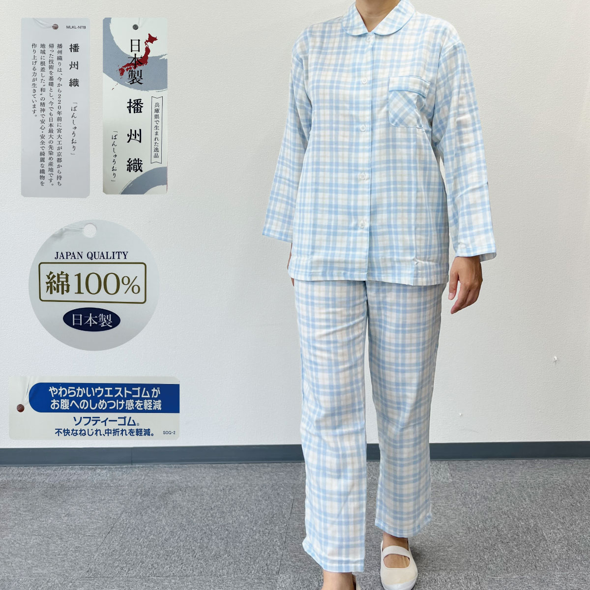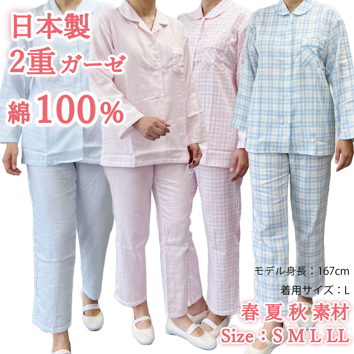パジャマ 前開き レディース 長袖 日本製 綿100% 2重ガーゼ 播州織 春 夏 涼しい 秋 S M L LL ボタン 襟付き コットン ナイトウェア ねまき 高齢者 シニア 女性 婦人 用 ダブルガーゼ