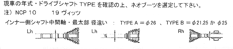分割ドライブシャフトブーツ (ネオブーツ、パロート) 片側 左右2個セットでお買い上げ希望の場合、割引あり!(別途出品しております) 前後 左右 内外 品番 フロント/前輪左右共通アウター(ホイールサイド)B-D04 純正番号 04427-52170 ※必ず純正番号をご確認いただくか、お車情報をご記入の上、ご注文ください。 車名 型式 エンジン 排気量 年式 ヴィッツNCP102NZ13002002.8〜2002.11 備考 クラウディア U タイプC ※現車確認要 材質はこれから主流になるウレタン系樹脂材を使用しており、曲げやねじれに強く、材質の劣化も少ない樹脂と樹脂を溶着させているために、接合面からグリースがにじんだりはがれたりする心配はありません。 シャフト側の接合はグロメットにて調整している為、接合部に余裕があり無理なく作業できます。 ピットワークの分割式ドライブシャフトブーツと全く同じ物です。
