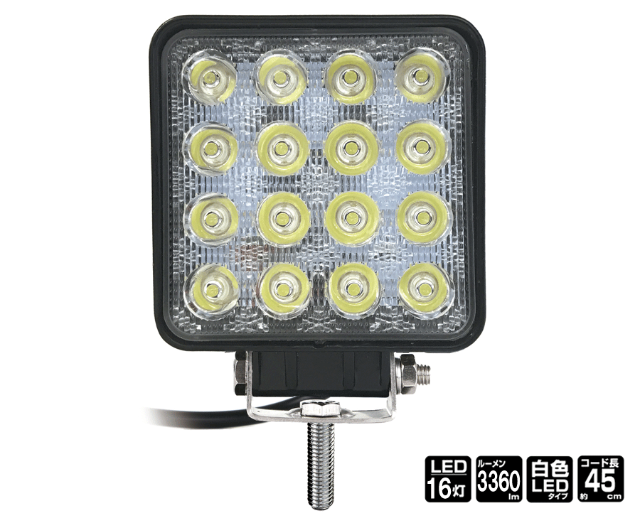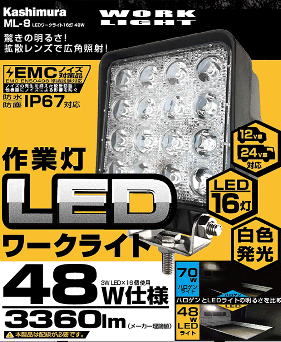 カシムラ製 LED ワークライト 16灯 48W 1個 ML-8取付場所を選ばない角度調整取付ステー付白色 LED コード長約45cm 3360lmDC12/24V車対応 裏面放熱スリット車両用LEDワークライト 作業灯 パーツキング