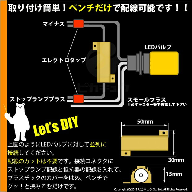 ストップランプ警告灯防止抵抗ユニット(12V21W用)10Ω ストップランプを純正球からLEDのバルブに変更した際に起こる 球切れ警告を防止する10Ωメタルクラッド抵抗器です。 素材は放熱効果に優れたアルミ製ヒートシンクを採用。 高品質で、安定した精度を誇ります。 結線用コネクタを付属しておりますので、あとはペンチ1本で取り付け簡単!アルミテープ付!取付説明書付! [製品の特長=Pika-Qのこだわり] 50W10Ω 12V使用時の消費電力は14.4Wに相当します。 本製品はストップランプ側の配線に接続してください。 球切れ警告動作とは メーターパネル内に球切れ警告等がある車種においては、警告灯が点灯しますが、警告灯が無い車両において、以下の動作が球切れ警告の場合があります。 ※ABSランプ点灯 ※フューエールカット機能 ※変速動作カット機能 ※ストップランプから切り替わらない(エンジン始動後) ※サイドブレーキ警告灯点灯等 車両により動作は異なる場合がございます。 [必ずお読みください] ◆LEDの消費電力により抵抗値は異なってきます。また、同一車種においても車両の個体差により 対応できない場合があることを予めご了承の上お買い求めください。 ◆本製品でも解決しない場合、リアスモール側の警告の場合もございます。その場合は別途39Ω抵抗をリアスモール側に装着することで解決する場合もございます。 商品仕様 商品名 ストップランプ警告灯防止抵抗ユニット(12V21W用)10Ω サイズ L50mm×W30mm×H15mm(ビス穴・突起部含む・配線含まず)配線:約300mm 入数 抵抗1個・コネクタ2個・アルミテープ1枚 許容消費電力 50W (12V使用時の消費電力14.4W相当) カラー ゴールド 品番 DIY-G-50W10Ω 保証期間 ご購入日から3ヶ月保証 ピカキュウ,LED専門店ピカキュウ,メタルクラッド抵抗,50W10Ω,21W相当,球切れ警告,ブレーキランプ警告,ABSランプ点灯