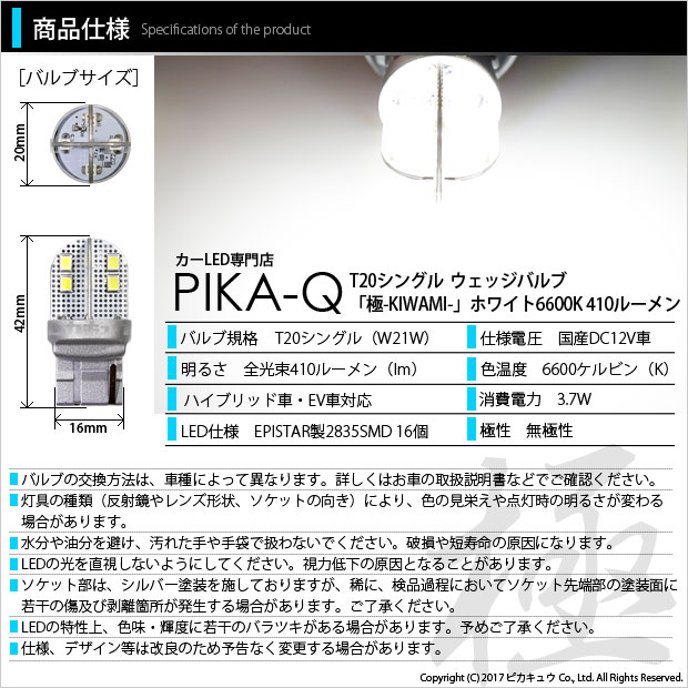 マツダ RX-8[SE3P 前期モデル]対応 バックランプ用LEDバルブ T20シングル 極-KIWAMI-(きわみ)全光束410lm ウェッジシングル球 LEDカラー:ホワイト 色温度6600K 1セット2個入り 2835型POWER SMDを16個マウントしリフレクターを最大限に活かす強烈でワイドな照射光を可能にした「極-KIWAMI-」LEDバルブシリーズが新発売です。 純正白熱球フィラメントと同位置にSMDを配置。理想的な光の広がりを実現しました。LEDバルブ1球で明るさ全光束410ルーメン(lm)のスペックのバックランプ専用T20シングルウェッジ球。 バックランプとして必要十分な光量を確保しています。 [製品の特長=Pika-Qのこだわり] 灯具内での理想的な光の広がりを実現 LEDバルブ1球に2835型POWER SMDを純正白熱球フィラメントと同位置に配置し、リフレクターを最大限に活かす強烈でワイドな照射光を実現しました。 全光束410lmの明るさ LEDバルブ1球の明るさは全光束410ルーメンの大光量を確保しています。色温度は視認性の良い6600ケルビンクラスを採用。 徹底した放熱対策とバルブデザイン 熱伝導性に優れるアルミ基板を採用し効率よく放熱を促進します。光量低下率を抑え明るさと長寿命を実現しています。 ハイブリッド車対応 定電流回路を搭載し突発的な車両電圧変化に影響されることなく安定した点灯を確保します。ハイブリッド車両にも安心してご使用いただけます。 T20白熱球と同等サイズ 純正T20白熱球と同等サイズ。バルブ規格[W21W]であれば安心してお使いいただけます。 無極性 極性を気にせず簡単装着が可能です。通常のバルブ交換と同じ要領で作業をしていただけます。 [必ずお読みください] ◆本製品は、バックランプ専用です。バックランプの使用を前提として設計されておりますので、その他の用途で使用しないでください。 ◆車種によっては、車両型式が一致していても、特別仕様車やオプション品などの条件により、商品ページに記載されている情報と異なる場合がございます。必ずご購入前に車両に装着されているバルブの形状(バルブ規格)をご確認ください。 [画像車両:MAZDA RX-8 型式:CBA-SE3P 平成17年6月登録車両] 商品仕様 商品名 MAZDA RX-8[SE3P 前期モデル]対応バックランプ用LEDバルブ T20シングル 極-KIWAMI-(きわみ)全光束410lmウェッジシングル球 LEDカラー:ホワイト 色温度6600ケルビン 1セット2個入り 仕様 国産DC12V車専用 [HV車・EV車対応] 規格 T20シングル[W21W] サイズ 全長:42mm/最大直径:20mm/幅:16mm ※純正T20白熱球サイズ 全長:44mm/最大直径:20mm/幅:16mm カラー ホワイト 色温度 6600ケルビン(K)クラス 明るさ 410ルーメン(lm)※ルーメン値は、バルブ1個の値を示しています。 保護回路 定電流回路搭載 消費電力 3.7W 極性 無極性 用途 バックランプ(後退灯) 入数 2個 品番 6-A-2[62000] 保証期間 お買い上げ日より18ヶ月間保証 ピカキュウ,LED専門店,LEDバルブ,国産DC12V車,ハイブリッド車対応LEDバルブ,T20シングル,W21W,バックランプ,後退灯,ホワイト,全光束410lm,極,KIWAMI,きわみ,マツダ,MAZDA,RX-8,rx8 rs,SE3P,前期 新発売!クラス最高性能の明るさ!LED MAGNUMはこちら↓