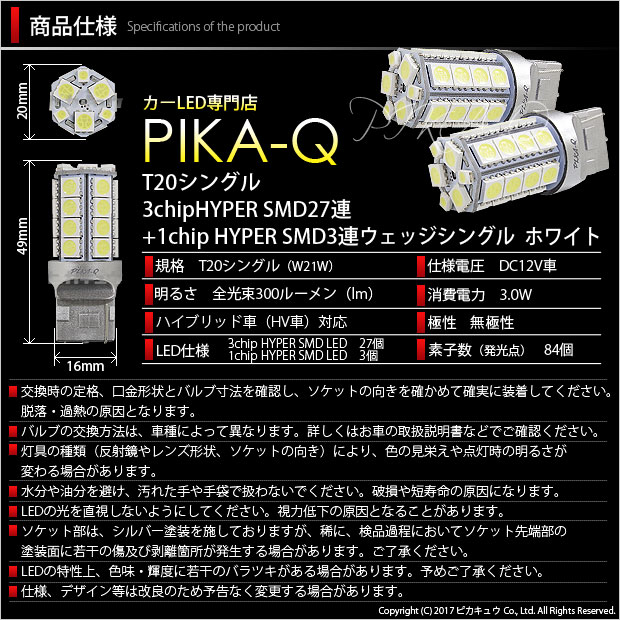 スバル XV [GT系](GT7/GT3/GTE)対応バックランプ用LEDバルブ T20シングル HYPER SMD30連ウェッジシングル球 LEDカラー:ホワイト 1セット2個入り バックランプ用T20シングルウェッジLEDバルブ。 HYPER SMD LEDを30個搭載。計84個もの発光点から放たれる強烈なホワイト照射光が魅力です。この煌めきがワンランク上のLEDメイクへと誘います! [製品の特長=Pika-Qのこだわり] 発光点総数84発 1つのバルブに発光点(素子数)が84個。拡散タイプの素子は灯具内で効率の良い光反射を実現しています。 明るさ300ルーメン 明るさは全光束300ルーメン(lm)のスペック。全方向に強烈なホワイト光が照射するので、灯具内のリフレクター全体に光が効率よく拡がります。 ハイブリッド車対応 定電流回路を搭載し突発的な車両電圧変化に影響されることなく安定した点灯を持続します。ハイブリッド車両にも安心してご使用いただけます。 SMDチップ高密度配置 SMDの配置間隔を限界まで狭めることによりバルブサイズの最大直径はT20純正白熱球と同じ20mmを確保しつつ、全長わずか49mmのコンパクトサイズを実現。スマートなバルブデザインでエクステリアをトータルコーディネートします。 消灯時のステルス性向上 ソケットをシルバー塗装することで、昼間の明るい時でもソケットが目立たず違和感なく収まります。 無極性 極性を気にせず簡単装着が可能です。 対応ソケット T20シングル[W21W]に対応します。 用途 バックランプ(後退灯) [必ずお読みください] ◆車種によっては、車両型式が一致していても、特別仕様車やオプション品などの条件により、商品ページに記載されている情報と異なる場合がございます。必ずご購入前に車両に装着されているバルブの形状(バルブ規格)をご確認ください。 [画像車両:SUBARU XV 型式:DBA-GT3 平成30年3月登録車両] 商品仕様 商品名 SUBARU XV[GT系](GT7/GT3/GTE)対応バックランプ用LEDバルブ T20シングル HYPER SMD 30連ウェッジシングル球 LEDカラー:ホワイト 1セット2個入り 仕様 DC12V車専用 [HV車・EV車対応] 規格 T20シングル[W21W] サイズ 全長:49mm/最大直径:20mm/幅:16mm ※純正T20白熱球サイズ 全長:44mm/最大直径:20mm/幅:16mm カラー ホワイト 明るさ 300ルーメン(lm)※ルーメン値は、バルブ1個の値を示しています。 保護回路 定電流回路搭載 消費電力 3.0W 極性 無極性 LED仕様 3chip HYPER SMD LED 27個 / 1chip HYPER SMD LED 3個 素子数 84個 用途 バックランプ(後退灯) 入数 2個 品番 6-B-1[20405] 保証期間 お買い上げ日より18ヶ月間 ピカキュウ,LED専門店,LEDバルブ,DC12V車,ハイブリッド車対応LEDバルブ,T20シングル,W21W,バックランプ,後退灯,ホワイト,HYPER SMD30連ウェッジシングル球,SUBARU,スバル,XV,GT7,GT3,GTE 新発売!クラス最高性能の明るさ!LED MAGNUMはこちら↓