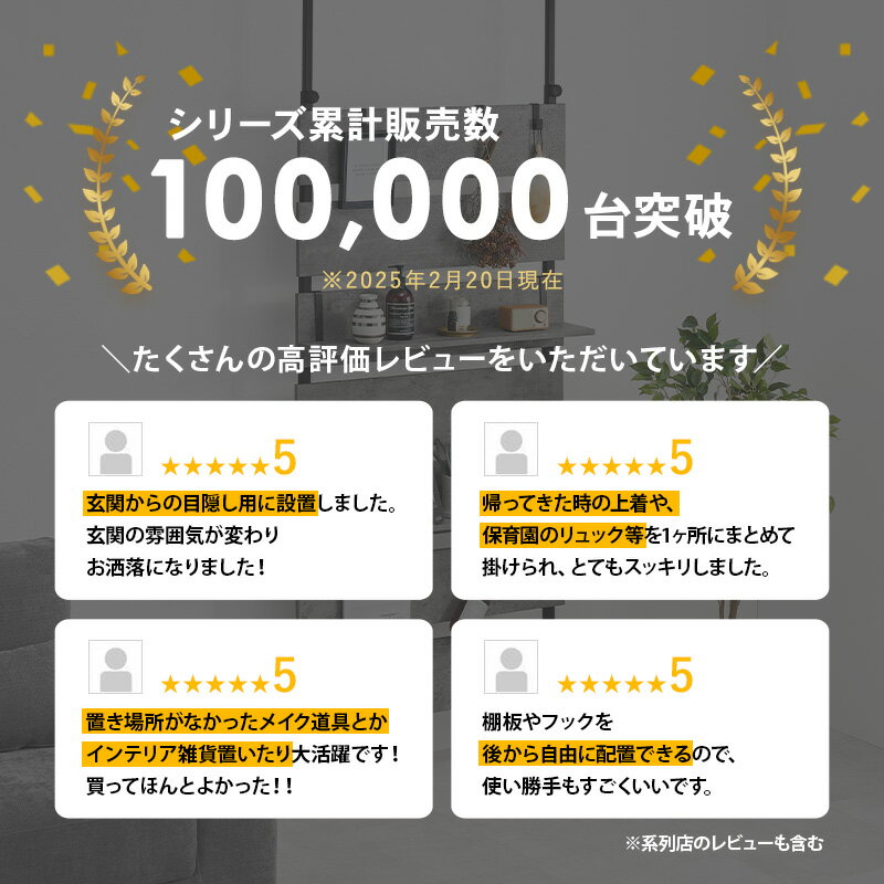 お買い物ガイド リビングやダイニング、玄関やキッチン、クローク、WIC、脱衣所やランドリールーム、洗面所、トイレなど、お部屋のいろいろな場所に設置できる突っ張り式ラック。 壁に穴を空ける必要が無いので、マンションやアパートなどの賃貸でも設置が可能。 パーテーションや間仕切りとしても活躍します。 付属パーツは壁板に引っ掛けるだけでどこでも設置でき、 使用シーンに合わせて自分好みのレイアウトにすることができます。 フックを使ってお気に入りのバッグを引っ掛けたり、 棚には貴重品やメイク用品などシーンに合わせた小物を置いたり。 カラーは北欧風インテリアやホワイトインテリア、韓国インテリアにぴったりな「ホワイト」「大理石調ホワイト」「ナチュラル」 モノトーンインテリアなどモダン系にも合わせやすい「ブラウン」「ブラック」「グレー」をご用意しました。 ■幅40cmタイプ 【商品サイズ(約)】幅40×奥行21.5×高さ200〜265cm 【梱包サイズ(約)】106x25x12cm(12.5kg) ■幅60cmタイプ 【商品サイズ(約)】幅60×奥行21.5×高さ200〜265cm 【梱包サイズ(約)】106x25x18cm(16.3kg) ■幅80cmタイプ 【商品サイズ(約)】幅80×奥行21.5×高さ200〜265cm 【梱包サイズ(約)】106x25x18cm(19.8kg) ■共通 【材質】 フレーム:スチール(粉体塗装) 棚板(ホワイト):合成樹脂化粧繊維板 棚板(ホワイト以外):プリント紙化粧繊維板 【生産国】中国 【備考】組立品(工具付属) メーカー希望小売価格はメーカーカタログに基づいて掲載していますその他の「Hang」シリーズ おすすめアイテム ▼他にも突っ張りラックを販売中 ▼コンクリート調家具特集