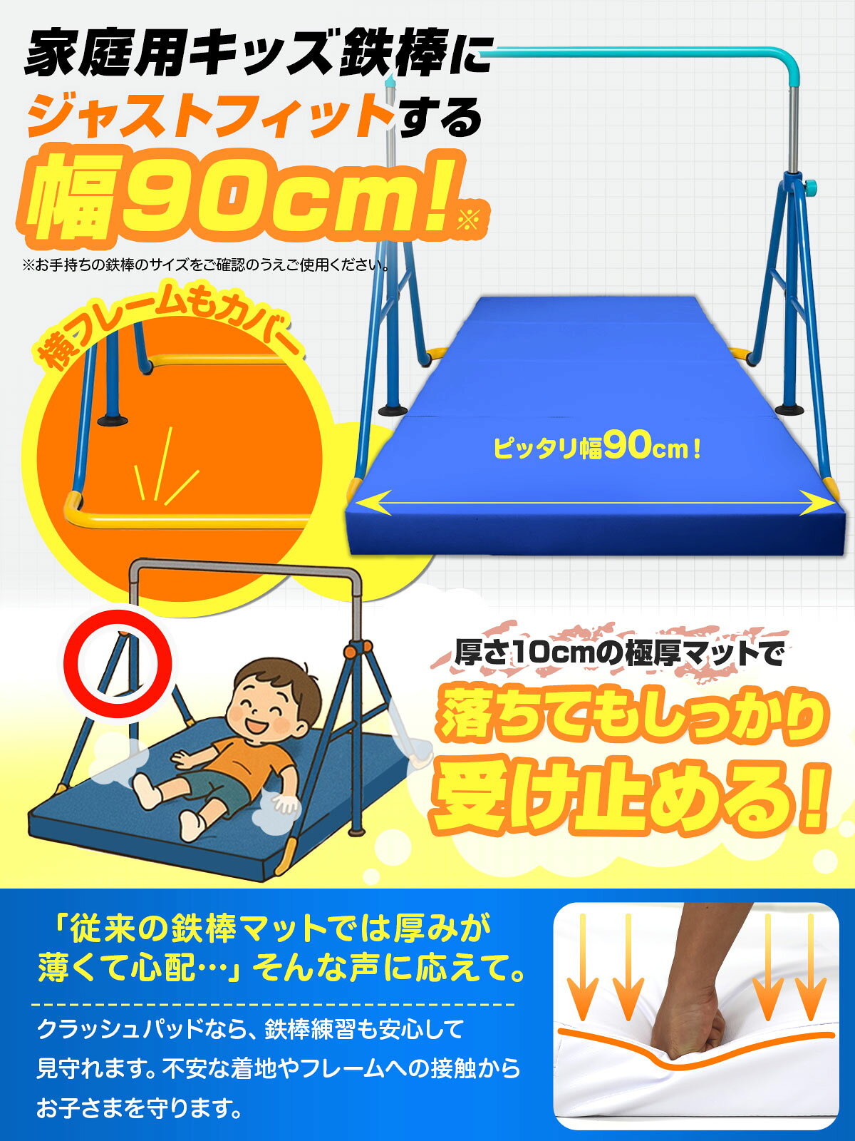 製品仕様 商品名 クラッシュパッド エバーマット 衝撃吸収 鉄棒 マット 室内 子供 ボルダリング 体操マット バク転 安全マット クッション 折りたたみ 跳び箱 とびばこ トランポリン 200×90×10cm サイズ 200×90×10cm 【重量】約6.9kg カラー ブラック、ブルー、グレー、モカ、ミルキーホワイト 素材/材質 マット:ウレタンフォーム、カバー:PVCレザー セット内容 マット単品 商品説明 【クラッシュパッドとは】ボルダリングやバク転などのアクロバットの落下ダメージを緩和し、ケガのリスクを軽減する極厚エバーマットです。トランポリンや器械体操などのセーフティマット・ランディングマットとして、スポーツ施設やアクティビティ施設、学校など多目的にお使いいただけます。 【キッズ鉄棒にぴったりサイズ】「薄い鉄棒マットでは薄くて心配…」というお声をいただき、家庭用キッズ鉄棒にジャストフィットする幅90cmサイズを作りました!長さも200cmあるので鉄棒のフレームをカバーでき、失敗してしまってもぶつかる心配がなくなります。 【安全設計にこだわっています】厚さ10cmのウレタンフォームを採用し、衝撃をしっかりと吸収するので安心してお使いいただけます。また、ファスナーにカバーを付けたので、引っ掛かったり等思わぬ事故も防ぎます。 【撥水性に優れてお手入れも簡単】防水加工が施された汚れに強いPVCレザーを採用し、汗や水で濡れてもサッと拭くだけで簡単にお手入れが可能。厚手にしたことにより破れにくく、屋外アクティビティやスポーツにも使用することができます。※完全防水ではございません。使用後は濡れない場所にて保管してください。【高所落下にも対応】200×100×15cm/3つ折りタイプはこちら 【キッズ鉄棒にぴったり】200×90×10cm/4つ折りタイプはこちら 【コンパクトサイズ】180×80×10cm/4つ折りタイプはこちら 【とびばこにおすすめ】120×90×10cm/3つ折りタイプはこちら 連結できる特大ストレッチマット/240×120×5cmはこちら コンパクトな体操マット/180×60×5cmはこちら 当店オリジナル素材を使った高耐久ストレッチマット/180×60×4.5cmはこちら ボルダリングやアクロバットに!クラッシュパッド/200×100×15cmはこちら