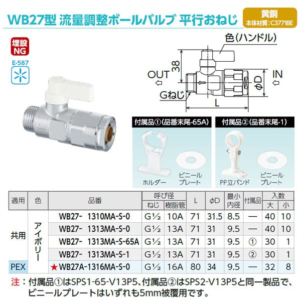 【WB27-1313MA-S-65A】オンダ製作所 WB27型 流量調整ボールバルブ 平行おねじ アイボリー G1/2×13A 大ロット 入数:30