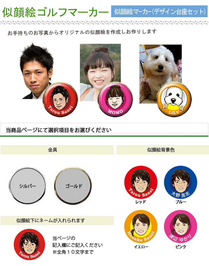 【 配送方法について 】 2種類の配送方法からお選びいただけます。 ●メール便(送料無料) ・メール便に関する注意事項は商品ページの画像でご確認ください。 ※他の送料別商品と同梱の場合、地域別の通常送料(有料)がかかります。 ご注文時は送料が0円と表示されますが、ご注文確認後、地域別の通常送料に修正させていただきます。ご注意ください。 ●宅配便 ご希望のお客様には商品代金に地域別の通常送料(有料)を加算する形で「宅配便配送」に対応致します。当ページの配送方法選択肢で「宅配便」をお選びください。ご注文時は送料が0円と表示されますが、ご注文確認後、地域別の通常送料を加算した額に修正させていただきます。ご注意ください。 ■ご注文のキャンセルにつきまして ・当商品はオーダーメイド商品につき似顔絵作成開始後のキャンセルはお受けできません。 ・似顔絵作成後、7日以上ご連絡が取れない場合キャンセル料金2,500円+消費税を請求させていただきます。 予めご了承の上ご注文をお願いいたします。 ■似顔絵につきまして ・似顔絵はお一人様のみ・お顔のみのデザインとなっております。 ・ペア、複数人の似顔絵は現在対応しておりません。 ■修正につきまして 修正は1回まで無料にて致しますが、以下のような大幅な修正はできませんので予めご了承ください。 ・似顔絵タッチの変更 ・元写真を変えての描きなおし ・髪型や顔の向き等、大幅に異なる内容の変更 ■納期につきまして 弊社より似顔絵デザイン送信後、デザインにご承諾いただけましてから3営業日にて出荷となります。 ■写真の送信につきまして ・当店でご注文確認後、写真送付先のメールアドレスをご案内させていただきます。 ・ご注文前に必ず楽天登録のメールアドレスが現在受信可能なものかご確認ください。 ・送信頂きました写真を元に似顔絵を作成しますので、顔の輪郭や、髪型、特徴が鮮明な画像を送信してください。 ・携帯電話でご送信いただく場合、PCメールが受信出来るように受信設定を変更してください。必ず「sanei-golf.co.jp」のドメインのメールを受信できるよう予め設定をお願い致します。 ・「肖像権の侵害」に該当する内容のものに関しては印刷をお断りさせて頂いております。こちらで肖像権の侵害の可能性があると判断した場合、ご注文をキャンセルさせていただきます。 ※写真の肖像権等についての責任は、すべてお客様に帰属しますので、予めご了承ください。 ※オーダーメイド商品の為、原則として商品の返品は受け付けておりません。 ■マーカーにつきまして ・材質 合金+樹脂ドーム加工 ・マーカーサイズ 内寸:直径 約23mm 外寸:直径 約24.5mm ・マグネット式