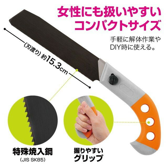発送予定 12:00までのご注文で日・祝日以外は即日出荷!(※銀行振込でお支払いの場合はご入金日の翌営業日の出荷となります) 商品説明 粗大ゴミの解体に! かさばる段ボールや木の枝、カーペット・じゅうたん、固くて切りずらいプラスチックや木製品などの幅広い種類の素材が切断可能なコンパクトタイプののこぎりです。 刃部は、特殊焼入鋼(JIS SK85)を使用しており、鋭い切れ味が持続します。 刃先の部分が通常の物とは違い滑らかな波形になっているので、硬いものからカーペットまで切断することができます。 女性にも扱いやすいコンパクトサイズで、手にフィットして握りやすいグリップです。 ご家庭に1本あると役立つ万能のこぎりです。 兵庫県の姫路で生産された安心の日本製です。 商品名 いろいろ切れる!万能のこぎり 商品サイズ 約D2.0×W28.6×H7.8cm(刃渡り:約15.3cm) 重量 (約)102g 素材・材質 刃:特殊焼入鋼(JIS SK85) 持ち手:ABS樹脂・熱可塑性エラストマー・シリコーン 製造国 日本製