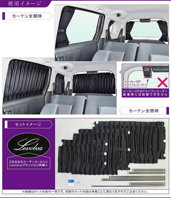 品名 / 型番 Levolva 10系/15系シエンタ サイドカーテン / LVC-70 適合車種 TOYOTA/トヨタ MXPL10G/MXPL15G/MXPC10G SIENTA(シエンタ)/SIENTA HYBRID(シエンタハイブリッド) ※メーカーOPのドライブレコーダー装着車には装着できません セット構成 ・カーテン(2列目席用左右各1枚、3列目窓用左右各1枚、バックドア用左右各1枚 計6枚) ※フロントカーテン(別売)はセットに含まれておりません ・部位別カット済みカーテンレール(色:黒 / 樹脂製 / 両面テープ貼付済) ・カーテンレール用キャップ(色:黒 / 樹脂製) ・レール固定補強ネジ ・プライマー(3M社製 両面テープ用接着促進剤) ・イラスト入り専用取説 カラー ・ブラック〈BK〉 リヤガラスに カメラ機器等 を装着車の 対応について リヤガラスにカメラ機器(ドラレコやインナーミラーのリヤカメラなど)等を装着車の場合、機器本体や配線等がレール取付位置やカーテン生地に干渉し、想定した方法での取付けができない恐れがある為、不適合とさせていただきます ※お客様都合による返品はお受け出来ませんので、自己判断・自己責任のもとご検討ください※ 備考 ◆ 3列目カーテンは上側レールのみの仕様となります ◆ 取り付けには2列目上部の後席用サンシェード用フックを取り外す必要があります ◆ 本製品取り付け後、後席用サンシェードは使用できません ◆ カーテン生地の特性上、多少ストレッチして取り付ける箇所があります ◆ 車内をクールでラグジュアリーな雰囲気に彩るドレスアップアイテムです ◆ 高遮光生地なので車中泊・オートキャンプ・アウトドアの際にも日除け・目隠しとしてご使用いただけますLevolva<レヴォルヴァ>10系/15系シエンタ専用サイドカーテンセット / LVC-70 Levolva 10系/15系 シエンタ サイドカーテン LVC-70