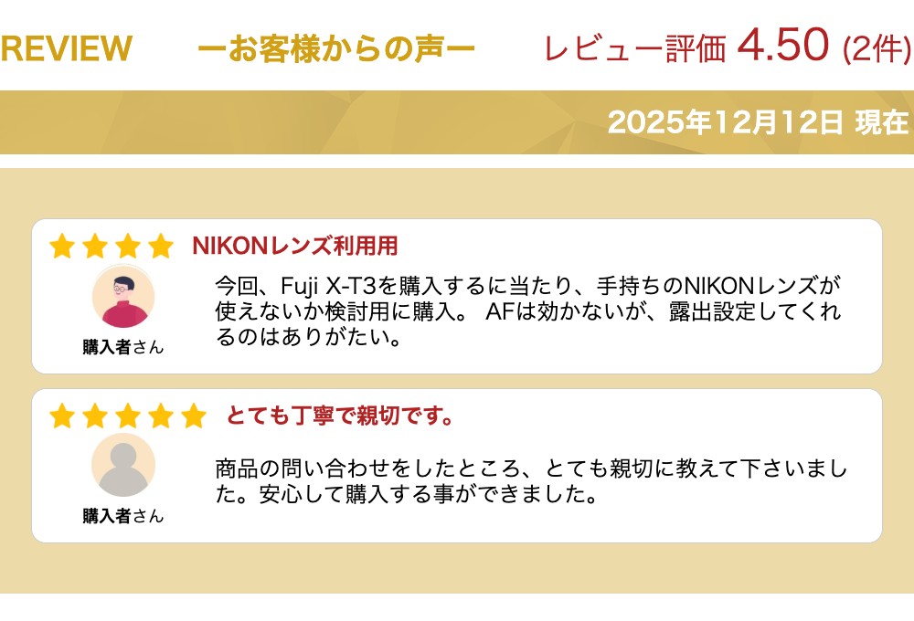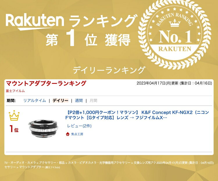 3,980円以上で送料無料(一部地域除く)営業日14時までのご注文で当日出荷(状況により異なります) 商品説明 ニコンF(Gタイプ対応)マウントレンズをフジフイルムXマウントのカメラボディに装着するための、マウント変換アダプターです。より使いやすく改良された新型です。 改良型の特徴 光の乱反射を抑えるように艶消し塗装による内面反射を大幅カット。 ボディ側とレンズ側に真鍮製マウントパーツを採用、耐久性アップ。 仕様 型番 KF-NGX2 対応レンズマウント ニコンF(Gタイプ対応)マウント 対応カメラマウント フジフイルムXマウント その他 絞りリング付き 備考 ご使用時にはカメラの「メニュー」-「レンズなしレリーズ」を「ON」にしてください 注意事項 生産ロットによりマウントアダプターのデザインが写真と異なる場合があります。 当店はK&F Concept正規代理店のため、常に最新バージョンの商品をお届けいたします。 About K&F Concept K&F Concept(ケーアンドエフ コンセプト)は、レンズやフィルター、アダプター、三脚、カメラバックなど、様々なカメラ周りのアクセサリーを扱っているブランド。 洗練されたデザイン、研究、製造、革新的な製品の創造に力を注いでいます。