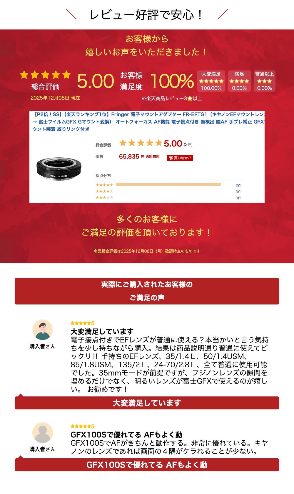 3,980円以上で送料無料(一部地域除く)営業日14時までのご注文で当日出荷(状況により異なります) 位相差AF対応の多機能アダプター 絞りリング搭載|Product By Fringer Fringer(フリンガー)FR-EFTG1は、キヤノンEFマウントレンズを富士フイルムGマウントのカメラで使用するための電子マウントアダプターです。AE/AFに対応し絞りリングを搭載しています。マウント面は高耐久性・高剛性の真鍮パーツを採用し、高い精度での取り付けが可能です。 特徴 EFレンズとの組み合わせで、AE/AF撮影が可能 GFX100シリーズの位相差AFに対応(※1) 動画AFおよびコンティニュアスAF(AF-C)に対応(※1)(※2) 「顔検出」「瞳AF」に対応 アダプター側の絞りリングで絞り制御、撮影モードの切り替え(※3)可能 レンズ内の手ブレ補正機構(キヤノン「IS」、シグマ「OS」、タムロン「VC」)に対応 ボディ内の手ブレ補正機構に対応 倍率色収差(横色収差LaCA)自動補正機能搭載(※1) 撮影した画像の焦点距離、露出などの情報はExifデータとして記録 アダプター内部の植毛加工により内面反射を制御 カメラ側マウント接合部にラバーリングを採用 PC端末とのUSB接続で、ファームウェアのアップデート可能 ※1 メーカーオフィシャルサイト内に記載の対応レンズのみ有効 ※2 位相差センサー搭載カメラGFX100、GFX100Sのみ有効 ※3 撮影モードの切り替え機能はGFX50S・GFX50Rのみ対応 仕様 型番 FR-EFTG1 レンズマウント キヤノンEF カメラマウント 富士フイルムG 最新情報 ファームウェアのアップデート情報は、焦点工房サポートページ(「サポート & ダウンロード/焦点工房」で検索)よりご確認ください。 注意事項 動作音について:富士フイルムのカメラは、絞り優先(A)およびプログラム(P)モードに設定した場合、液晶を適正な明るさで表示させるため、被写体の明るさに応じてレンズの絞り羽が動作します。カメラを傾ける等でレンズを透過する光量が変化すると、その度に絞り羽が動き、動作音が純正レンズより大きく聞こえ、液晶画面がわずかに点滅する場合があります。動作音や液晶画面の点滅が気になる場合は、撮影モードをマニュアル(M)モードに切り替えて使用してください。 位相差AF非搭載機種(GFX50S II、GFX50S、GFX50R)では、AF-Sモードの使用をお勧めします。 動画撮影でのAF動作は、カメラ本体のAF性能に依存します。また、位相差AF非搭載機種では動画撮影時にAFを使用することはできません。 メーカーの違いにより、レンズの装着感(固い、緩い、若干のあそび等)が異なる場合があります。 本品を質量が1300gを超えるレンズに装着して使用する場合は、カメラ本体とレンズの両方を支えながらご使用ください。カメラだけを持つことや、カメラストラップを使用した撮影は、マウント部の変形や破損の原因となりますのでおやめください。 マウントアダプターには三脚用ネジ穴がありますが、三脚座付き望遠レンズをご使用の場合は、レンズの三脚座を三脚に取り付けてください。 CPU信号接点、レンズ信号接点は汚さないようにご注意ください。 通電時のアダプターやレンズの取り外しは、故障の原因になりますのでおやめ下さい。 マウントアダプターを水にぬらすと、部品がサビつくなどして故障の原因になりますのでご注意ください。 高温になる場所に置かないでください。極端に温度が高い環境では、変形のおそれがあります。 使用中にフリーズしたときには、一旦カメラの電源をOFFにし、アダプターとレンズを取り外してください。取り外し後は、しばらく時間を置いてからアダプターとレンズを再度装着し、カメラの電源をONにしてください。 生産ロットによりデザインが写真と若干異なる場合があります。 焦点工房はFringer(フリンガー)の正規代理店です。自然故障に限り1年間保証いたします。 関連商品 Fotodiox EF-GFX-FSN About Fringer ソフトウェア関連の仕事に20年間従事しながら、CONTAXレンズ愛好者であり、カメラ好きが高じて、2013年より高性能でスマートさにこだわった電子系アダプターの製作に取り組んでいます。 関連商品【P2倍!SS】【楽天ランキング1位】Fringer 電子マウントアダ...【P2倍!SS】K&F Concept レンズマウントアダプター KF...69,300円4,189円【P2倍!SS】【楽天ランキング1位】Fringer 電子マウントアダ...【P2倍!SS】【楽天ランキング1位】TECHART 電子マウントアダ...75,240円53,865円