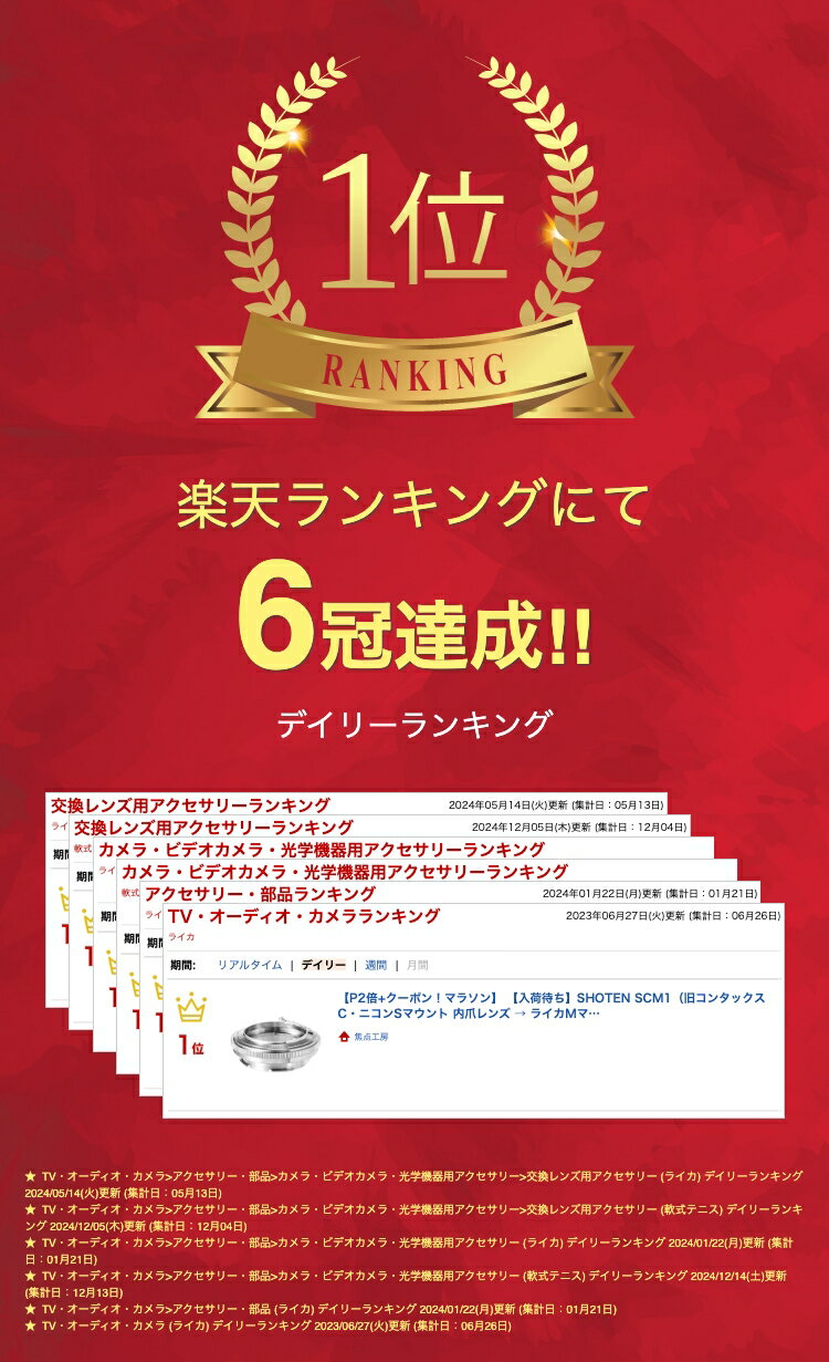 3,980円以上で送料無料(一部地域除く)営業日14時までのご注文で当日出荷(状況により異なります) 関連商品 SHOTEN SCM2 SHOTEN SCM1 SCM2 セット SHOTEN(ショウテン)SCM1は、旧コンタックスC・ニコンSマウントの内爪レンズをライカMマウントに変換するマウントアダプターです。Mマウントレンズ用のヘリコイド付きアダプターや、AF化アダプターと併用することで、ピント調整が可能になります。本体は高耐久・高剛性の真鍮製で、高い精度での取り付けを実現しています。 併用可能なアダプターの例 ソニーE用 TECHART LM-EA9(AF可) Fotodiox LM-SNE-PRN II(AF可) SHOTEN LM-SE M II SHOTEN LM-SE M (L) ニコンZ用 TECHART TZM-02(AF可) Fotodiox LM-NKZ-PRN(AF可) SHOTEN LM-NZ M (EX) (B) 富士フイルムX用 Fotodiox LM-FXRF-PRN(AF可) キヤノンRF用 SHOTEN LM-CR M (EX) (B) Lマウント用 SHOTEN LM-LSL M 仕様 型番 SCM1 機能 旧コンタックスC・ニコンSマウント 内爪レンズ → ライカMマウント変換 素材 真鍮 質量 約70g 注意事項 本製品にピント調整機構や距離計連動機構はございません。 ロシア製のレンズは非対応となります。 レンズの個体差・経年変化・損傷による形状の変化等により、装着感(固い、緩い、若干のあそび等)が通常と異なる場合や、装着できない場合があります。 必ずしもすべての互換性を保証するものではありません。アダプターは、お客様ご自身の責任でご使用ください。 製品の仕様・デザインを予告なく変更する場合があります。 SHOTEN(ショウテン)は焦点工房の自社ブランド。自然故障に限り1年間保証いたします。 関連商品【P2倍!SS】K&F Concept レンズフィルター NANO-X...【P2倍!SS】【楽天ランキング1位】SHOTEN マウントアダプター...4,230円20,710円【P2倍!SS】K&F Concept レンズフィルターNANO-X ...【P2倍!SS】【楽天ランキング1位】SHOTEN マウントアダプター...3,690円9,405円