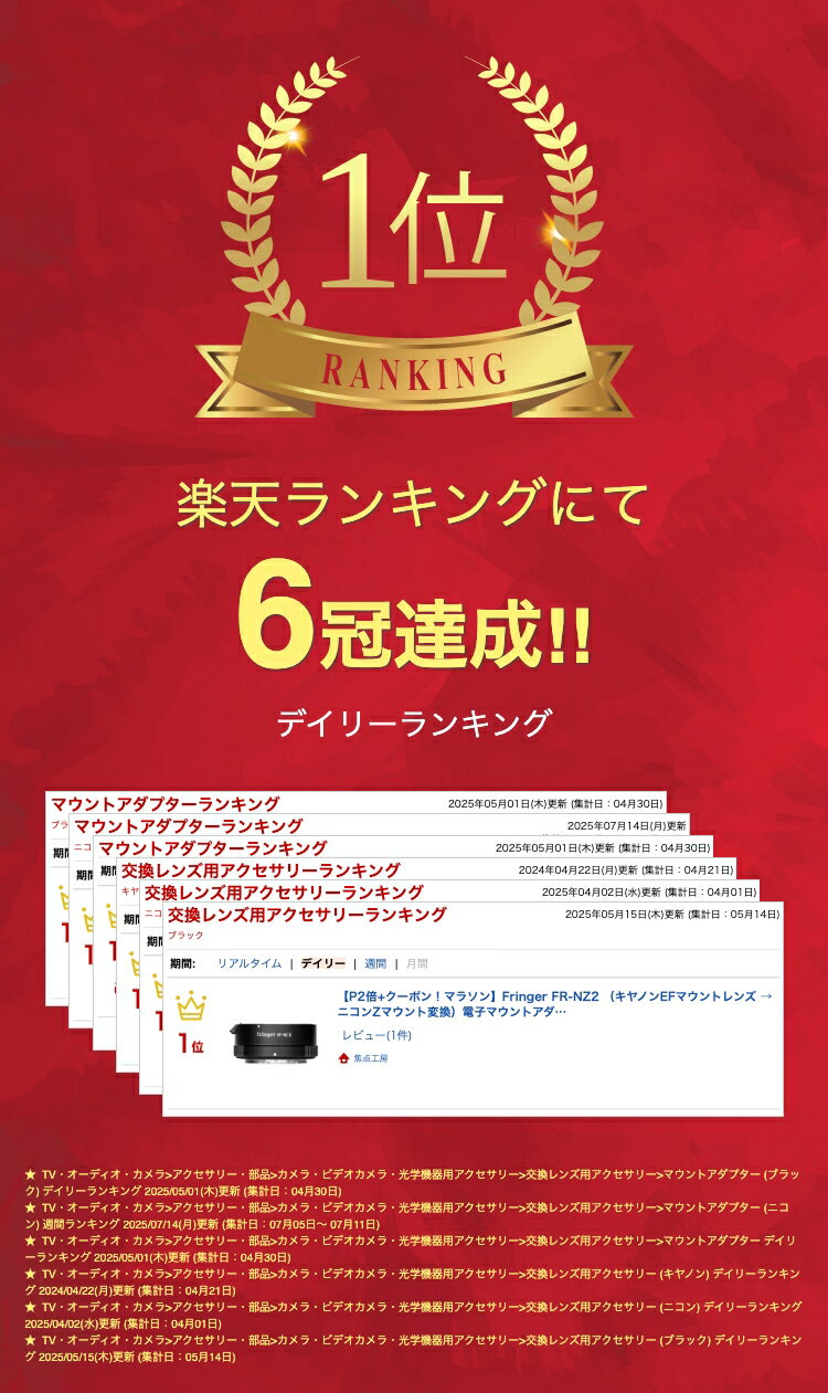 関連商品 TECHART TZC-01 SHOTEN CEF-NZ Fringer (フリンガー)「FR-NZ2」は、キヤノンEFマウントレンズをニコンZマウントで使用するための電子マウントアダプターです。前モデル「FR-NZ1」の三脚座を廃止することで小型・軽量化され、ゴムシーリングの採用等により、防塵防滴に配慮した設計になりました。 特長 EF/EF-Sレンズとの組み合わせで、AE/AF撮影が可能 動画AFおよびコンティニュアスAF(AF-C)に対応 「顔検出」「瞳AF」に対応 レンズ内の手ブレ補正機構(キヤノン「IS」、シグマ「OS」、タムロン「VC」)に対応(※) ボディ内の手ブレ補正機構に対応(※) カメラ側での絞り制御に対応 撮影した画像の焦点距離、露出などの情報はExifデータとして記録 アダプター内部の艶消し塗装と植毛加工により内面反射を抑制 埃や水滴の侵入を防ぐゴムシーリングの採用等、防塵防滴に配慮した設計 本体下部の三脚座廃止により、小型化と軽量化 PC端末とのUSB接続で、ファームウェアのアップデート可能 ※同時使用は不可 撮影する前の確認事項 必要に応じて「AF微調整」を行う お使いのレンズによっては、フォーカスエイドおよびオートフォーカスのピント位置がずれる場合があります。必要に応じて「AF微調整」を行ってからお使いください。 ※設定方法は、カメラの使用説明書をご覧ください。 手ブレ補正機能について レンズとカメラ両方に手ブレ補正機能が搭載されている場合、どちらかの手ブレ補正機能をOFFにしてご使用ください。(レンズ側手ブレ補正をONにしてのご使用がおすすめです)レンズとカメラ両方とも手ぶれ補正をONにして使用すると逆にブレてしまいますので、ご注意ください。 MFレンズでは、カメラのセットアップメニュー[レンズ情報手動設定]で焦点距離を設定することで、カメラの手ブレ補正機能を使用できます。 動画AF 「AF速度」の設定方法 本製品は動画撮影中のAFにも対応しております。また、一部のレンズはカメラ本体から「AF速度」(-5 〜 +5)の設定により、動画モードのピント合わせの速度を設定できます。 ※「AF速度」の設定機能に対応するレンズはこちらでご確認ください。 ※設定方法は、カメラの使用説明書をご覧ください。 前モデルから三脚座を廃止し小型軽量化 防塵防滴に配慮した設計 動作確認デモ 仕様 型番 FR-NZ2 対応レンズマウント キヤノンEF(EF-S対応) 対応カメラマウント ニコンZ ※今後発売の新機種の対応について、万が一動作しない場合は本製品のファームウェアアップデートで対応する予定です。 最新情報 ファームウェアのアップデート情報は、以下のサポートページよりご確認ください。 焦点工房サポートページ 注意事項 機材の個体差、経年変化や損傷による形状の変化等により、装着感(固い、緩い、若干のあそび等)が通常と異なる場合や、装着できない場合があります。 合焦速度や精度、動画撮影のAF対応などは、カメラ・レンズとの相性に依存します。 オートフォーカスでピントが合いにくい時は、カメラのフォーカスモードをシングルAFに設定し、中央のフォーカスエリアで合わせてください。AFが不安定な場合は、マニュアルフォーカスでのご使用を推奨いたします。稀にレンズ側の手ぶれ補正機能をオフにすると使用できる場合がございます。 カメラやレンズのご購入時のファームウェアバージョンにより、動作不良が発生する場合があります。互換性を向上させるため、アダプターのファームウェアの更新をお待ちください。 すべての撮影機能、およびすべての対応機材が使用できることを保証するものではございません。 アダプターまたはレンズの取り付け・取り外しは、カメラ本体の電源を「OFF」にしてから行ってください。 本品を重量1300gを超えるレンズに装着して使用する場合、カメラ本体とレンズ両方を支えながらご使用ください。カメラ本体のみを持ってのご使用は、マウント部の変形や破損の原因となりますのでおやめください。 万が一使用中にフリーズしたときは、カメラの電源をOFFにしてアダプターを再度装着し直してください。 製品の仕様・デザインを予告なく変更する場合があります。 焦点工房はFringer(フリンガー)の正規代理店です。自然故障に限り1年間保証いたします。 About Fringer ソフトウェア関連の仕事に20年間従事しながら、CONTAXレンズ愛好者であり、カメラ好きが高じて、2013年より高性能でスマートさにこだわった電子系アダプターの製作に取り組んでいます。