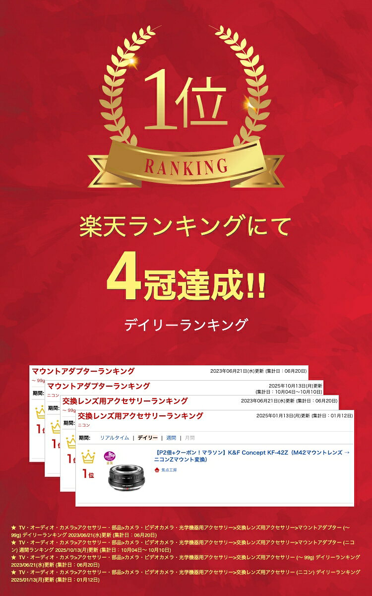 【P2倍!BF】【楽天ランキング1位】【DGP受賞】 K&F Concept マウントアダプター KF-42Z( M42マウントレンズ → ニコンZマウント変換 )国内正規品 メーカー保証1年 レンズマウントアダプター オールドレンズ スクリュー 真鍮製 焦点工房