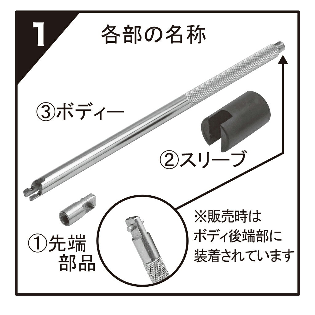 [保証] 初期不良保証■タイヤバルブ先端のネジ山に取り付けて、樹脂部分をホイールにあててテコの作用で引き抜きます。■バイクのホイールの場合、従来品ではハンドルがホイールに干渉してタイヤバルブをネジ山に装着するのが困難でした。本品はハンドルとヘッド部を別体とすることによって作業が飛躍的に簡単になりました。■また、従来品ではテコの支点となる樹脂の高さが不足する場合がありましたが、本品は樹脂にミゾを設けることによって、従来の方法と樹脂を縦方向に支点に使用する2通りの使用ができるようになり、高さの問題を解決しました。■バイクはもちろん、乗用車(4輪)のタイヤバルブにも使用できます。[全長] 250mmタイヤバルブ装着ツール 自動車・バイク兼用はタイヤバルブ(スナップインタイプ)をホイールに装着するために使用します。ハンドルとヘッド部を別体とすることによってバイクでの作業が飛躍的に簡単になりました。