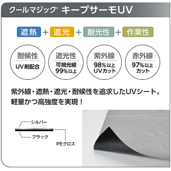 UV剤配合で耐候性アップ! 雨・雪・埃などから製品を守ります 【特長】 ●UV剤配合で耐候性アップ、また生地は#3400相当のため軽量で強度もあります。 ●遮光性:可視光線99%以上で光をしっかり遮ります。 ●紫外線(UV):98%以上カットしますので紫外線から中の製品ダメージを防ぎます。 ●赤外線:97%以上カットすることにより中の製品が熱くなりづらいです。 ●防水仕様:シート同士の接合部は溶着加工のため屋外でも雨などが染み込みづらいです。(裾部分はミシン縫製) ●絞り仕様:裾部に入っているロープで絞ることによりバタつきを防止。カバーが飛びにくくなっています。 ●生地は表面がシルバー系、裏面がブラックです。 【用途】 野済み、防塵、雨、汚れ、物流、保管時のパレットカバー。 養生カバー。保温・保冷・断熱カバー。遮光カバー。UVカバー。 【注意】 ●製造上多少のサイズ誤差があります。 ●完全防水ではありません。 ●データは試験値であり保証値ではありません。 ●パレットは別売りでカバーのみが本製品です。 【商品詳細】 サイズ:約1200mm×1200mm×1300mm(H) 材質:PE 色:(表面)シルバー/(裏面)ブラック シート厚さ:約0.26mm 質量:1.6Kg オプション:裾絞り仕様 【送料】 ■全国送料無料 ※沖縄・離島への配送は対応しておりません。 ※御注文時に法人名や店名等のご入力をお願い致します。 【サンユー印刷は、2023シーズン J1リーグへ昇格した「アルビレックス新潟」のオフィシャルクラブパートナーになりました。悲願のJ1復帰で新たな挑戦をするクラブを地元企業として微力ながらサポートさせていただきます】キープサーモUV 紫外線・遮熱・遮光・耐候性パレットカバー 屋外 保管 粉塵 雨除けキープサーモUV 紫外線・遮熱・遮光・耐候性パレットカバー 屋外 保管 粉塵 雨除け