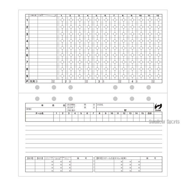 ジームス 手帳スコア表セット 専用用紙 15試合分 バイブルサイズ対応 野球観戦 記録用 スコアブック zeems ZAT-600 野球用品 スワロースポーツ