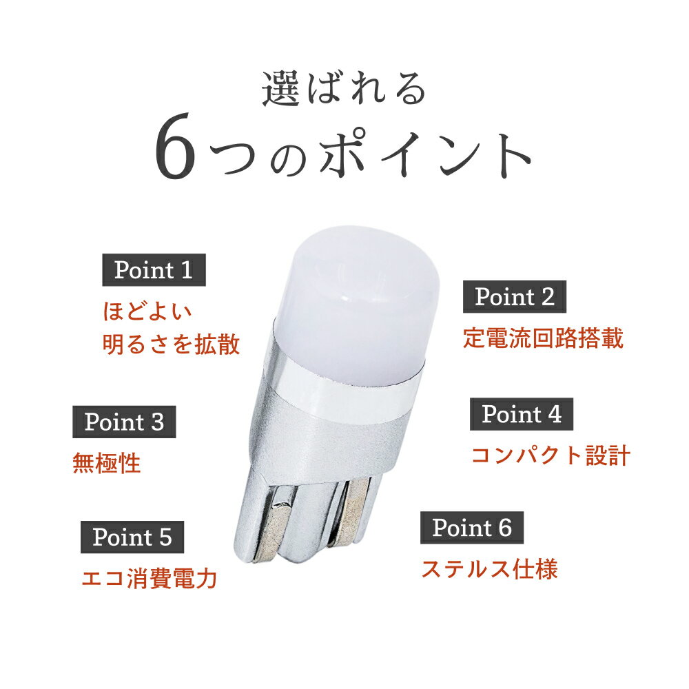 ■10球セットはこちら >> ■2球セットはこちら >> 仕様 バルブ形式T10 明るさ150lm / 1灯 75lm ケルビン数6500k(ホワイト) 電圧12V車対応 消費電力1.6W / 1球 0.8W 商品内容LEDバルブ×4球 保証2年保証 ※商品発送日から2年 商品説明 ポジション球、ナンバープレート、ルーム球、トランクルーム球、ハイマウントストップランプ、カーテシランプ等に最適なLEDバルブです。 【注意点】 ■通常バルブ形式が合っていれば99%問題ございません。バルブ形式は弊社の車種別適合表にてご確認いただけます。 ■お客様に少しでも安価でご提供させて頂くために高価な箱は使わず簡単な包装にさせて頂いております。 ■バージョンアップした商品は予告無しに外観が変わる場合がございます。あらかじめご了承ください。 ■いかなる場合でも取り付けに掛かった工賃や、破損部品の弁償などは行いません。 ■本製品を取り付ける際にソケットが劣化している場合や変形している場合はヒューズが切れる場合がございますので、必ず取り付け前に車両のソケットの状態をご確認ください。 バルブ形式適応車種一覧 ■普通車 ハイエース、フリード、プリウス、C-HR、RAV4、ヤリス、スイフト、ハイラックス、ロッキー、 アクア、ルーミー、CX-30、ヴェルファイア、フォレスター、レヴォーグ、シエンタ、リーフ、 ライズ、アルファード、ノア、ヴェゼル、デリカ、86、CX-3、NX250、キックス、シビック、 トール、レガシィ、カローラ、ノート、ヴォクシー、クラウン、ステップワゴン、セレナ、 ソリオ、ハリアー、フィット、ランドクルーザーW、CX-60、MAZDA2、アウトランダー、 インプレッサ、パッソ、CX-5、CX-8、MAZDA3、NX350H、エクストレイル、クロスビー、 NV200、スプリンター、トランスポーター、プロフェッショナル・デュカト ■軽自動車 ジムニー、n-box、タント、エブリイ、ハスラー、ハイゼット、ジムニーW、キャスト、ムーヴキャンバス、n-wgn、アルト、ピクシスジョイ、ミラ、ムーヴ、ライフ、ワゴンr 純正がLEDの場合、当製品が取り付けれない車種もあります。お手数ですが必ずバルブの形式をご確認ください。※ヤリス、86、レガシィ等の一部車種は年式によって対応可否が異なります。 詳しくは車種別適応表をご確認ください。 ※ご購入の際は車種別適応表を十分にご確認の上、 ページに記載されているバルブの寸法や形状もご確認ください。