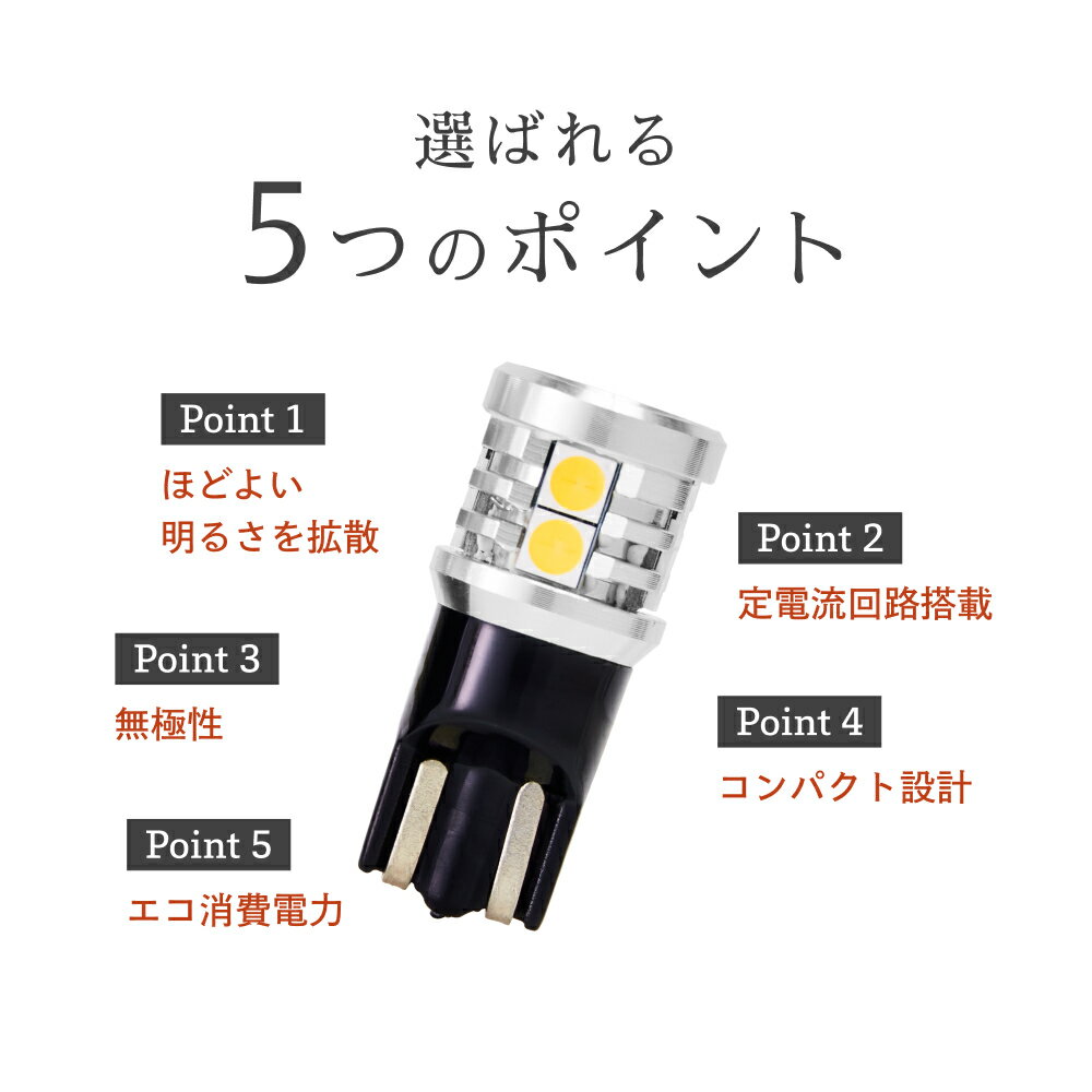 仕様 バルブ形式T10 ウェッジ球 極性なし 明るさ540lm / 1灯 270lm ケルビン数6500k(ホワイト) 消費電力4.4W / 1球 2.2W 電圧12V車対応/24V車非対応 商品内容LEDバルブ×2球 保証1年保証 ※商品発送日から1年 商品説明 トップにレンズを採用しないことでワイドに発光!ポジション、ナンバー灯、ルームランプ、カーテシランプ、トランクルームなどに最適なLEDバルブです。 【注意点】 ■通常バルブ形式が合っていれば99%問題ございません。バルブ形式は弊社の車種別適合表にてご確認いただけます。 ■お客様に少しでも安価でご提供させて頂くために高価な箱は使わず簡単な包装にさせて頂いております。 ■バージョンアップした商品は予告無しに外観が変わる場合がございます。あらかじめご了承ください。 ■いかなる場合でも取り付けに掛かった工賃や、破損部品の弁償などは行いません。 ■本製品を取り付ける際にソケットが劣化している場合や変形している場合はヒューズが切れる場合がございますので、必ず取り付け前に車両のソケットの状態をご確認ください。 バルブ形式適応車種一覧 ■普通車 ハイエース、フリード、プリウス、C-HR、RAV4、ヤリス、スイフト、ハイラックス、ロッキー、 アクア、ルーミー、CX-30、ヴェルファイア、フォレスター、レヴォーグ、シエンタ、リーフ、 ライズ、アルファード、ノア、ヴェゼル、デリカ、86、CX-3、NX250、キックス、シビック、 トール、レガシィ、カローラ、ノート、ヴォクシー、クラウン、ステップワゴン、セレナ、 ソリオ、ハリアー、フィット、ランドクルーザーW、CX-60、MAZDA2、アウトランダー、 インプレッサ、パッソ、CX-5、CX-8、MAZDA3、NX350H、エクストレイル、クロスビー、 NV200、スプリンター、トランスポーター、プロフェッショナル・デュカト ■軽自動車 ジムニー、n-box、タント、エブリイ、ハスラー、ハイゼット、ジムニーW、キャスト、ムーヴキャンバス、n-wgn、アルト、ピクシスジョイ、ミラ、ムーヴ、ライフ、ワゴンr 純正がLEDの場合、当製品が取り付けれない車種もあります。お手数ですが必ずバルブの形式をご確認ください。※ヤリス、86、レガシィ等の一部車種は年式によって対応可否が異なります。 詳しくは車種別適応表をご確認ください。 ※ご購入の際は車種別適応表を十分にご確認の上、 ページに記載されているバルブの寸法や形状もご確認ください。