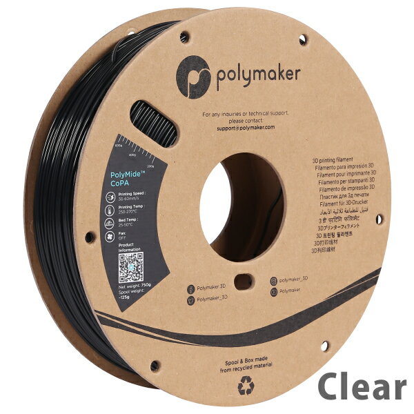 PolyMide™ CoPAは、ナイロン6とナイロン6,6のコポリマーをベースにした3Dプリンター用のフィラメントです。 このフィラメントは、優れた強度、靭性、および180°Cまでの耐熱性(ビカット軟化温度)を兼ね備えています。 最良のプリント結果を得るためには、材料を常に乾燥状態(相対湿度20%以下)に保つためにPolyBox™を使用することをお勧めします。 >>PolyBoxのご購入はこちら 反らない PolyMideTM CoPAはプリント中にほとんど反りが発生しない優れた寸法安定性を持つように開発されました。 容易なプリント 他のナイロン・フィラメントと違い、PolyMide CoPAは極めて使いやすいフィラメントです。チャンバーや造形テーブルの加熱は必要でなく、ほとんどの3Dプリンターでお使いいただけます。 強靭 卓越した機械的性質と強靭さを持つPolyMide CoPAは、アイデアを形にするため用いるエンジニアリング素材の最良の選択肢です。 耐熱性 約180℃という高い軟化温度を持つPolyMide CoPAは、市場に存在するなかで最も高い耐熱性を持つ3Dプリント用造形材料の一つです。 PolyMide CoPA (Nylon) フィラメント基本仕様 カラー 全1色 ブラック *ナチュラルは生産終了となりました フィラメント径 1.75mm 重量 750g 推奨プリント温度 260℃ 推奨プリント速度 40mm/s 推奨ホッドヘッド温度 20〜50℃ 750gスプール詳細 パッケージ寸法 220mm(W) x 220mm(D) x 60mm(H) パッケージ重量 1.4kg スプール寸法 200mm(W) x 200mm(D) x 45mm(H) スプール内径 55mm(W) 製作事例
