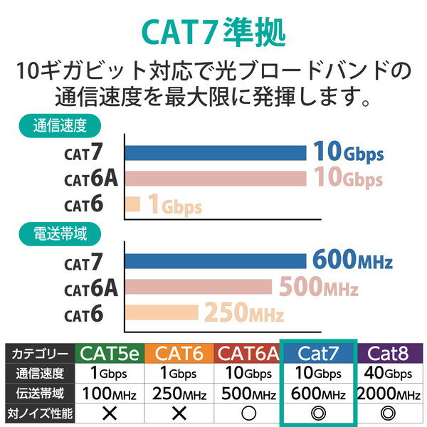 環境配慮事項:EU RoHS指令準拠規格:Cat7伝送帯域:600MHzケーブル長:0.5mケーブル太さ:5.7mmプロテクタと新素材コネクタ採用のダブル構造で、通常の使用環境では絶対にツメが折れない! ◆ツメ折れ防止プロテクタと、屈曲に対する耐久性が高い新素材コネクタのダブル構造◆10G BASE-Tに完全対応し、高速で安定したネットワーク環境を実現します。◆従来のケーブルより遮蔽効果に優れておりEMI(電磁妨害)対策にも最適◆エラー(エイリアンクロストーク)を防ぐ二重シールド構造◆金メッキシールドプラグを採用 / ■ 仕 様 ■インターフェイス:RJ-45コネクター規格:CAT7対応(10BASE-T/100BASE-TX/1000BASE-T/1000BASE-TX/10GBASE-T対応)伝送速度:10Gbps伝送帯域:600MHzケーブル太さ:5.7mm芯数:8芯結線方式:ストレート結線外部シース(被膜)材質:PVC導体構成:ヨリ線コネクタ有無:両端コネクター付 /