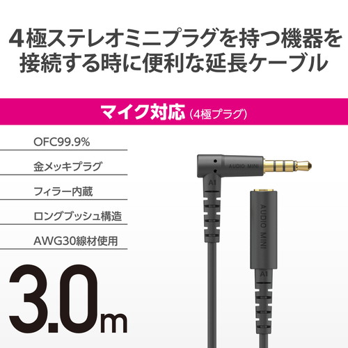 ■マイク対応φ3.5mm4極ステレオミニプラグを持つヘッドホン・イヤホンを接続する時に便利な延長ケーブルです。 ■内部線材どうしの摩擦による劣化を防ぐフィラーを内蔵しています。 ■太く頑丈な30AWG線材を使用しているので、延長による伝送ロスを徹底的に抑えます。 ■高純度OFC99.9%仕様により、信号の歪みの発生や伝送ロスをしっかり抑えます。 ■コネクターには、通常よりブッシュを長くすることでプラグ部分にかかる負担を軽減するロングブッシュ構造を採用しています。 ■耐久性が高く、スマートフォン・オーディオプレーヤー本体を操作する際に邪魔になりにくいL字コネクターを採用しています。 ■サビや信号の劣化を防止する金メッキプラグを採用しています。 ■コードの長さは屋内での長距離配線に便利な3mです。■コネクタ形状:φ3.5mm4極ステレオミニジャック-φ3.5mm4極ステレオミニプラグ(L型) CTIA規格準拠 ■対応機種:φ3.5mmステレオミニプラグを搭載したヘッドフォン・イヤフォン及び、φ3.5mmステレオミニジャックを搭載したパソコン及びゲーム機等 ■ケーブル長:約3.0m ※コネクターを除く ■カラー:ブラック ■OFC:99.9%高純度OFC ■プラグメッキ仕様:金メッキ ■パッケージ:ヘッダー付きPP袋+ステッカーマイク対応φ3.5mm4極ステレオミニプラグを持つヘッドホン・イヤホンを接続する時に便利な延長ケーブルです。