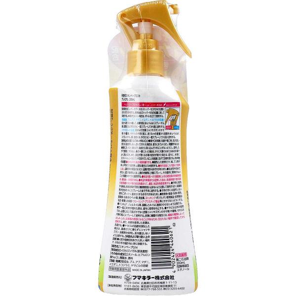 ※この商品は配送会社の都合により、北海道・沖縄・離島にはお届けできません。 ご注文が確認された場合、キャンセルさせて頂く可能性がございますのであらかじめご了承ください。有効成分(イカリジン※)の濃度を15%まで高めました。虫よけ効果が長時間(6〜8時間)持続します。舞い散りの少ないミストタイプです。●赤ちゃんから大人まで使える!お肌にやさしく、お子様への使用制限もないので、お肌の弱い方やお子様のいる方など、薬剤を肌に直接つけることに抵抗があるために虫よけ対策をしていない方にもおすすめです。●やさしい使い心地!お肌にやさしい潤水成分ヒアルロン酸Na配合。舞いちりが少なく、イヤなニオイもないので、虫よけを塗るのを嫌がるお子様でも気持ち良く使えます。●マダニにも効く!※化学名:1-メチルプロピル2-(2-ヒドロキシエチル)-1-ピペリジンカルボキシレート※イカリジンは、ピカリジンと呼ばれることもあります。 日本での登録名はイカリジンです。●皮膚アレルギーテスト済み!※すべての方にアレルギーが起きないということではありません。【使用方法】・レバーの下にある白いストッパーをOpenの位置に合わせる。・使用後はストッパーを元の位置に戻して保管する。・液が出にくい場合は、ボトルを立てて使用する。★蚊成虫、ブユ、アブ、マダニ、イエダニ、トコジラミの忌避・肌から約10cm離して、適量を肌の露出部にまんべんなくスプレーする。・顔・首筋には、手のひらに一度スプレーしてから肌に塗布する。★ヤマビルの忌避・肌および衣類や履物、それらの内側の肌に約10cmの距離から適量をまんべんなくスプレーする。・顔・首筋には、手のひらに一度スプレーしてから肌に塗布する。【防除用医薬部外品】販売名:スキンベープG14【効能・効果】蚊成虫、ブユ、アブ、マダニ、イエダニ、トコジラミ、ヤマビルの忌避【成分】有効成分:カリジン15%(原液濃度)その他の成分:エタノール、ヒアルロン酸Na、精製水、香料【注意】★してはいけないこと・眼や口の周囲、粘膜や傷口等、肌の弱い部分にはスプレーしないこと。誤ってかかった場合は、直ちに水でよく洗うこと。★相談すること・眼に入ったり、飲んだり、なめたり、吸い込んだりすることがないようにし、塗布した手で眼をこすらない。・万一眼に入った場合は、すぐに大量の水またはぬるま湯でよく洗い流す。また具合が悪くなる等の症状が現れた場合は、直ちに本剤にエタノールとイカリジンが含まれていることを医師に告げ、診療を受ける。★その他の注意・定められた使用方法を厳守する。・漫然とした使用をさけ、蚊、ブユ等が多い戸外での使用等、必要な場合にのみ使用する。・他の容器に入れ替えて使用しない。誤使用の原因になったり、品質が変わるおそれがあります。・乳幼児や初めて使う人、肌が敏感な人は、上腕の内側等に少量スプレーし、その箇所に異常のないこと確かめてから使用する。・本品の1回使用による忌避効果の持続時間は、概ね6〜8時間である。・本品を噴霧または塗布した後は、経過時間や使用時の使用者の発汗等の状況を踏まえて、適宜、本品を再度使用する。・子供に使用する時は、保護者等が子供に噴射物を吸い込まないよう注意して使用するか、保護者等が自分の手にスプレーした後で子供に塗布する。・子供の手には塗布しない(眼をこすったり、舐めたりするおそれがあるため)。・飲食物、食器、おもちゃ、飼料、観賞魚・小鳥等のペット類、皮革製品・毛皮・家具・塗装面・フローリング・プラスチック製品等にかからないようにすること。個装サイズ:74X213X38mm個装重量:約235g内容量:200mL製造国:日本※この商品は配送会社の都合により、北海道・沖縄・離島にはお届けできません。 ご注文が確認された場合、キャンセルさせて頂く可能性がございますのであらかじめご了承ください。