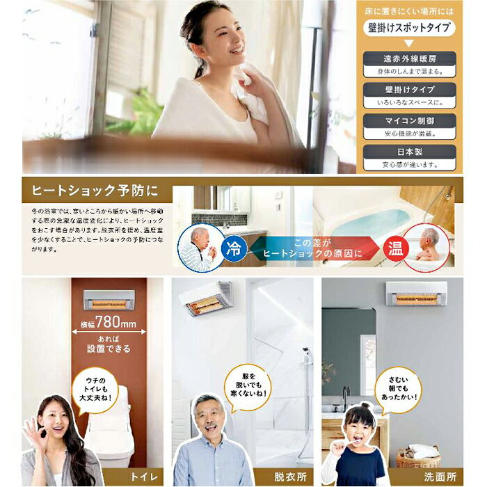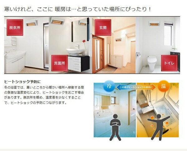 メーカー希望小売価格はメーカーサイトに基づいて掲載しています。商品名 壁掛型遠赤外線暖房器 ウォールヒート メーカー CORONA(コロナ) 品番 CHK-C12B(W) 商品説明 寒いけれど、ここに 暖房は…と思っていた場所にぴったり! ヒートショック予防に 冬の浴室では、寒いところから暖かい場所へ移動する際の急激な温度変化により、ヒートショックをおこす場合があります。脱衣所を暖め、温度差を少なくすることで、ヒートショックの予防につながります。 注意事項 ※商品の仕様・詳細につきましてはメーカーホームページまたはメーカー窓口でご確認ください。 沖縄・離島は別途送料が必要です。
