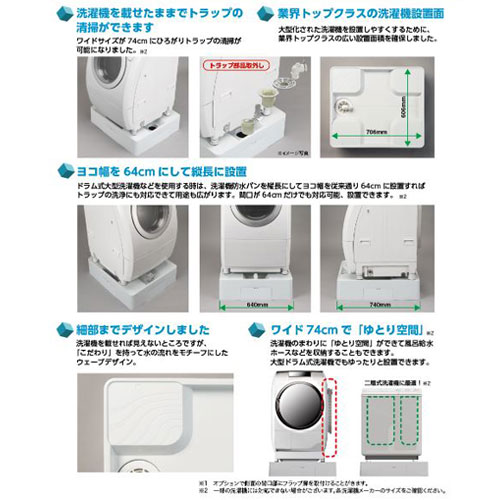 ↓オプションはこちらよりご選択下さい↓ FUB-7464SNW(洗濯機防水パン用74フロアアップベース ↓オプションはこちらよりご選択下さい↓ USBS-7464SNW用オプション品 USB-F64SNW(フラップ扉)スノーホワイト LJH-25(透明フレキシブルジョイント)商品名 74床上点検タイプ洗濯機防水パン 品番 USB-7464SNW カラー スノーホワイト 商品説明 床上点検タイプにワイド74cmが誕生! ※本製品は透明トラップ(1個)・フラップ扉(1個)が標準セットです。 ↓オプションはこちらよりご選択下さい↓ FUB-7464SNW(洗濯機防水パン用74フロアアップベース ↓オプションはこちらよりご選択下さい↓ USBS-7464SNW用オプション品 USB-F64SNW(フラップ扉)スノーホワイト LJH-25(透明フレキシブルジョイント)