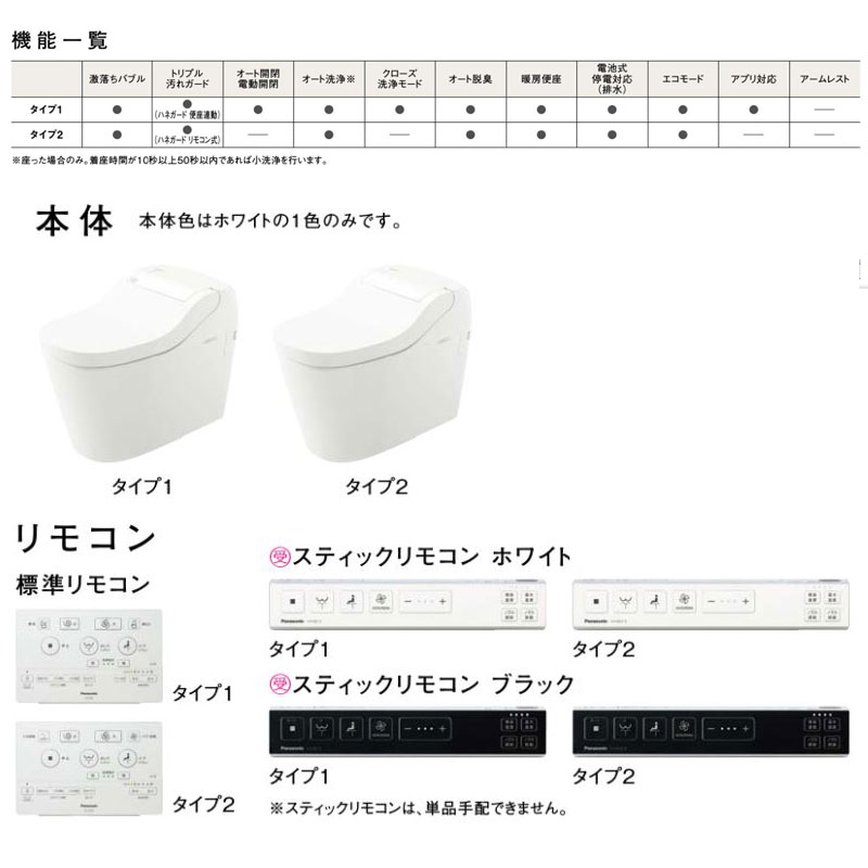 商品名 全自動おそうじトイレ アラウーノ S160シリーズ メーカー Panasonic / パナソニック 品番 セット品番 : XCH1602WS 本体 : CH1602WS 配管セット : CH160F 商品内容 S160シリーズタイプ : タイプ2 排水タイプ : 床排水 標準タイプ 便ふたカラー : WS ホワイト リモコン : フラットリモコン (アプリ対応なし) 商品説明 対応排水ピッチ : 120mm ・ 200mm ※水圧確認のお願い 最低水圧0.05MPa(流動時) 機能一覧 ・激落ちバブル ・トリプル汚れガード ・オート洗浄※1 ・オート脱臭 ・暖房便座 ・電池式停電対応(排水) ・エコモード ※1 座った場合のみ。着座時間が10秒以上50秒以内であれば小洗浄を行います。 詳細はメーカーホームページ等でご確認をお願いいたします。 寒冷地仕様をご希望の方は購入前に弊社まで連絡ください。 タイル床用品番をご希望の方は弊社までご連絡ください。 ※壁排水タイプにはタイル床用品番はございません。 ※タイル床用には寒冷地用は設定しておりません。 注意事項 沖縄・離島は別途送料が必要です。 お急ぎの方はご購入前に弊社まで納期の確認をお願いいたします。 商品詳細はメーカーホームページでご確認ください。 ▼洗浄補充液はこちらから購入できます▼