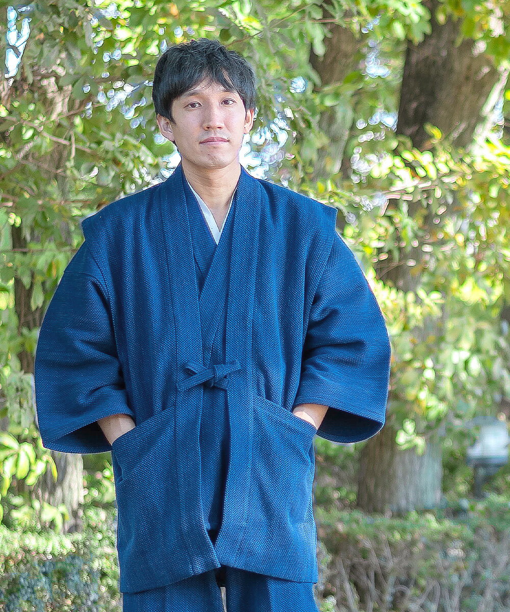 簡単文字刺繍 簡単丈詰め加工 ギフト包装 お手入れ方法 羽織る重厚感。愉しむ藍染め太刺子の変化。 先染めの藍染の糸を敢えてゆっくりと織り上げることで、 肉厚でありながら柔らかな仕上がりを実現。和粋庵の数ある生地の中で、最も肉厚な刺子織生地を羽織りに仕立てました。 どの作務衣に合わせても重厚感を纏うことのできる、迫力のある羽織。 手洗いする度に愛着が増す、藍染の経年変化も愉しみのひとつです。 サイズ M / L / LL 上着 左右ポケット各1個 素材 表地:綿100%裏地:ポリエステル100% 洗濯方法 手洗い※色落ちをしますので、他のものと一緒に洗わないでください。 製造 日本